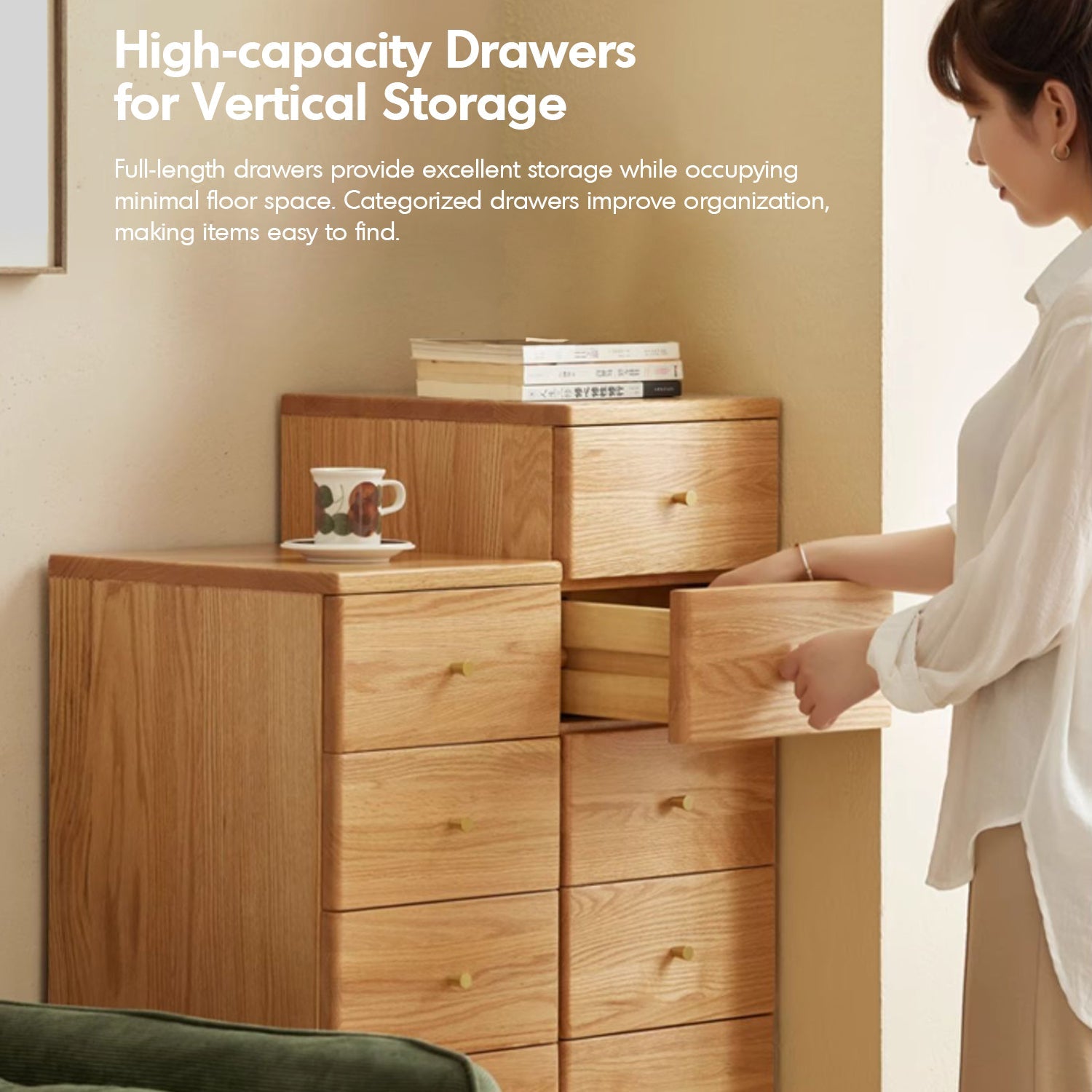 Four-tier drawers provide high-capacity vertical storage, ideal for organizing essentials in the bedroom, living room, or entryway. |