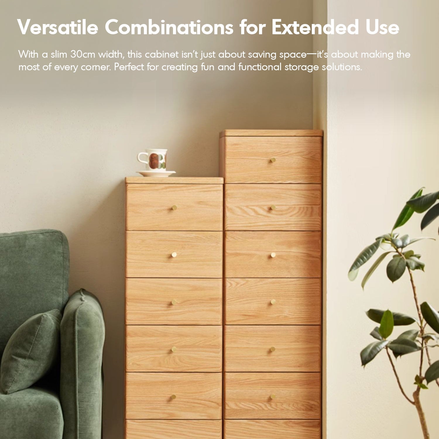 At just 30cm wide, it fits seamlessly into narrow spaces, making it perfect for small homes or as a supplementary storage solution. |