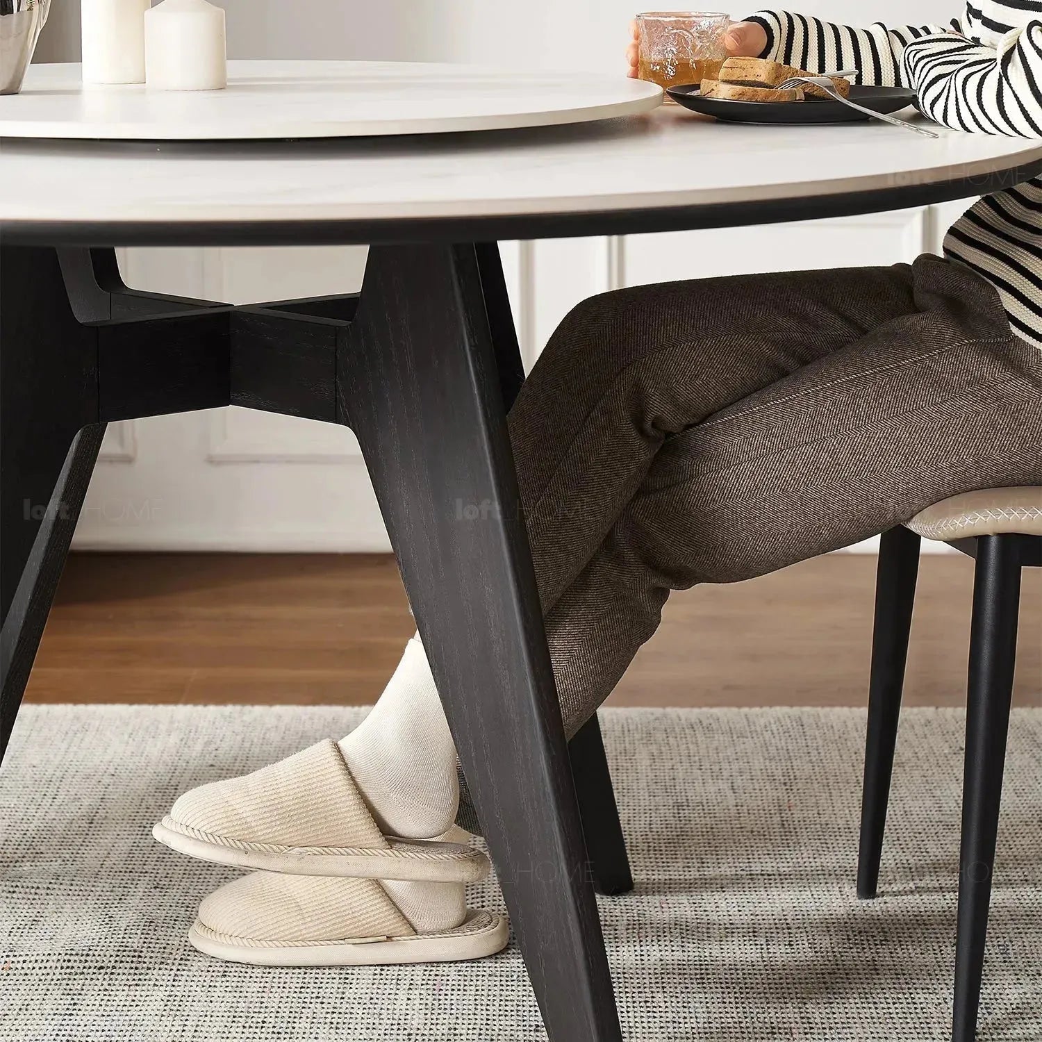 Scandinavian Sintered Stone Round Dining Table BELLY with a sturdy and stylish design, featuring a combination of slate and solid wood. The legs are uniquely designed, exuding a touch of luxury. The slate turntable makes it perfect for family dining and adds a modern touch to any dining room or kitchen. Its rock-solid construction ensures durability, while the sleek design adds a touch of elegance to the space.