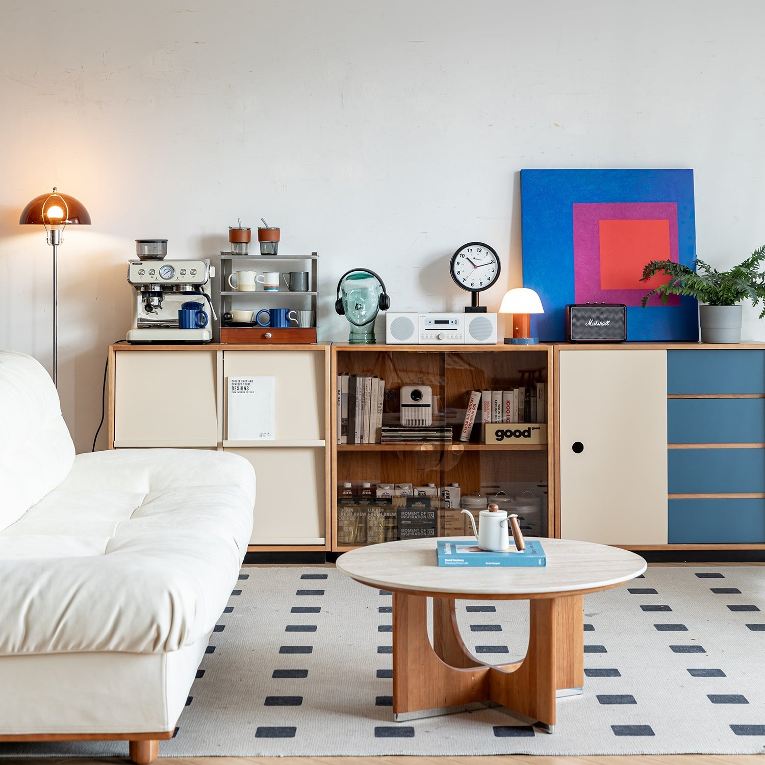 Classic vintage inspired design with warm wood tones and playful color blocks brings timeless charm and elegance to your living space |