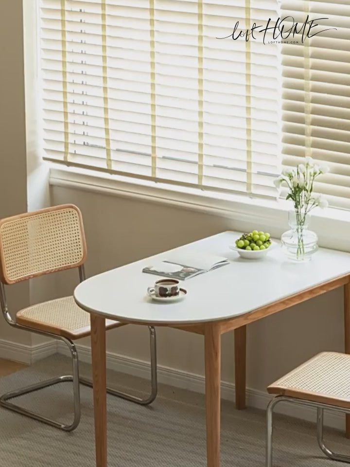 The Scandinavian Oak Wood Sintered Stone Half Oval Dining Table HALO blends innovative design with practical functionality. Its unique half-oval shape combines a square table's spaciousness with a round table's cosiness. Crafted from premium North American oak, it features a scratch-resistant, heat-resistant, and stain-resistant sintered stone top. The seamless wall-fit design saves space, while the sturdy construction ensures stability and durability.