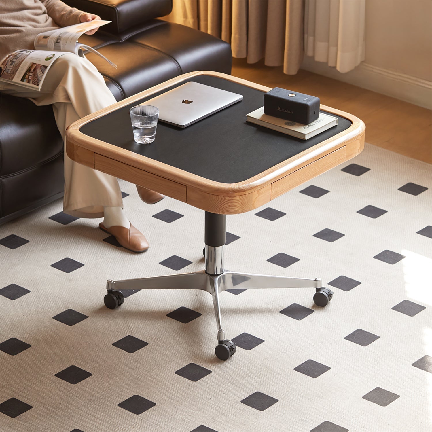 Scandinavian oak wood wheeled height adjustable gaming table coffee table drift with context.