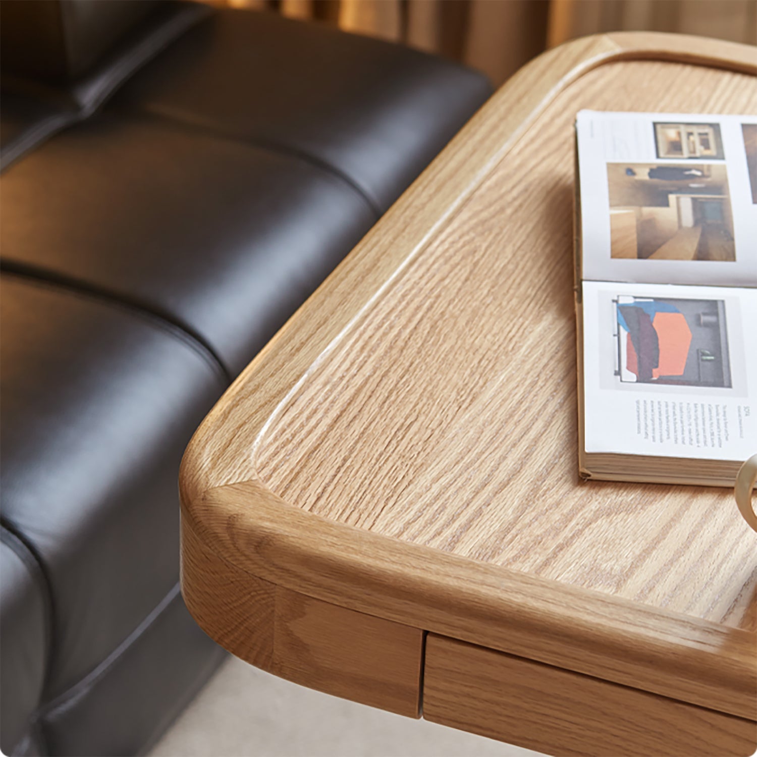 Scandinavian oak wood wheeled height adjustable gaming table coffee table drift in close up details.