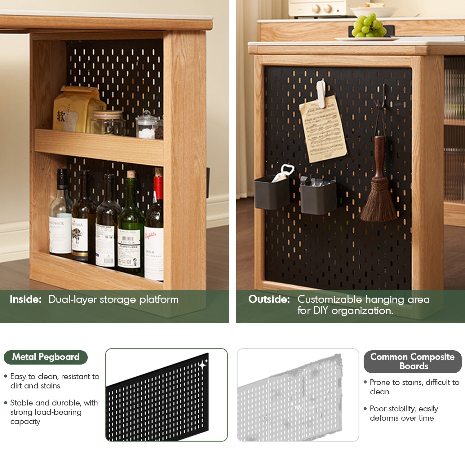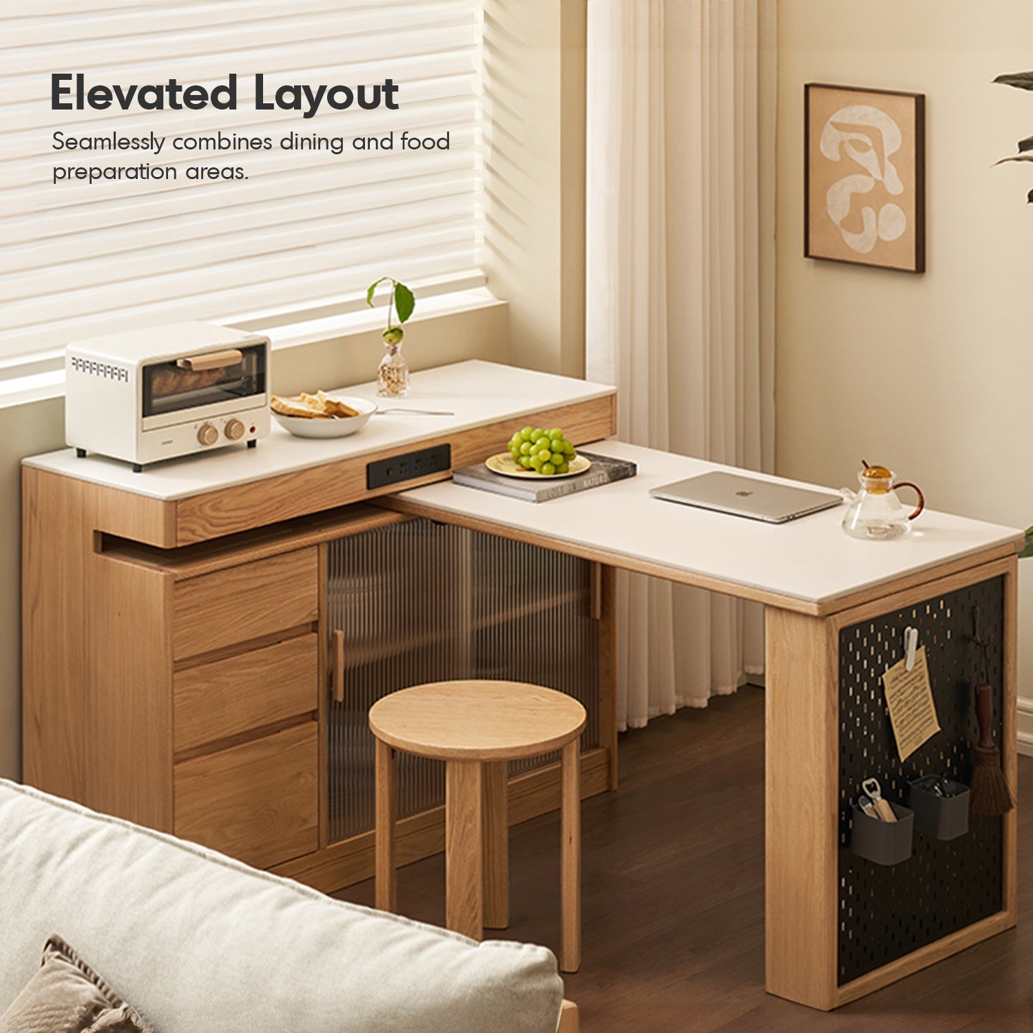 Combines durability with modern aesthetics, offering a spacious surface for dining and preparation. |