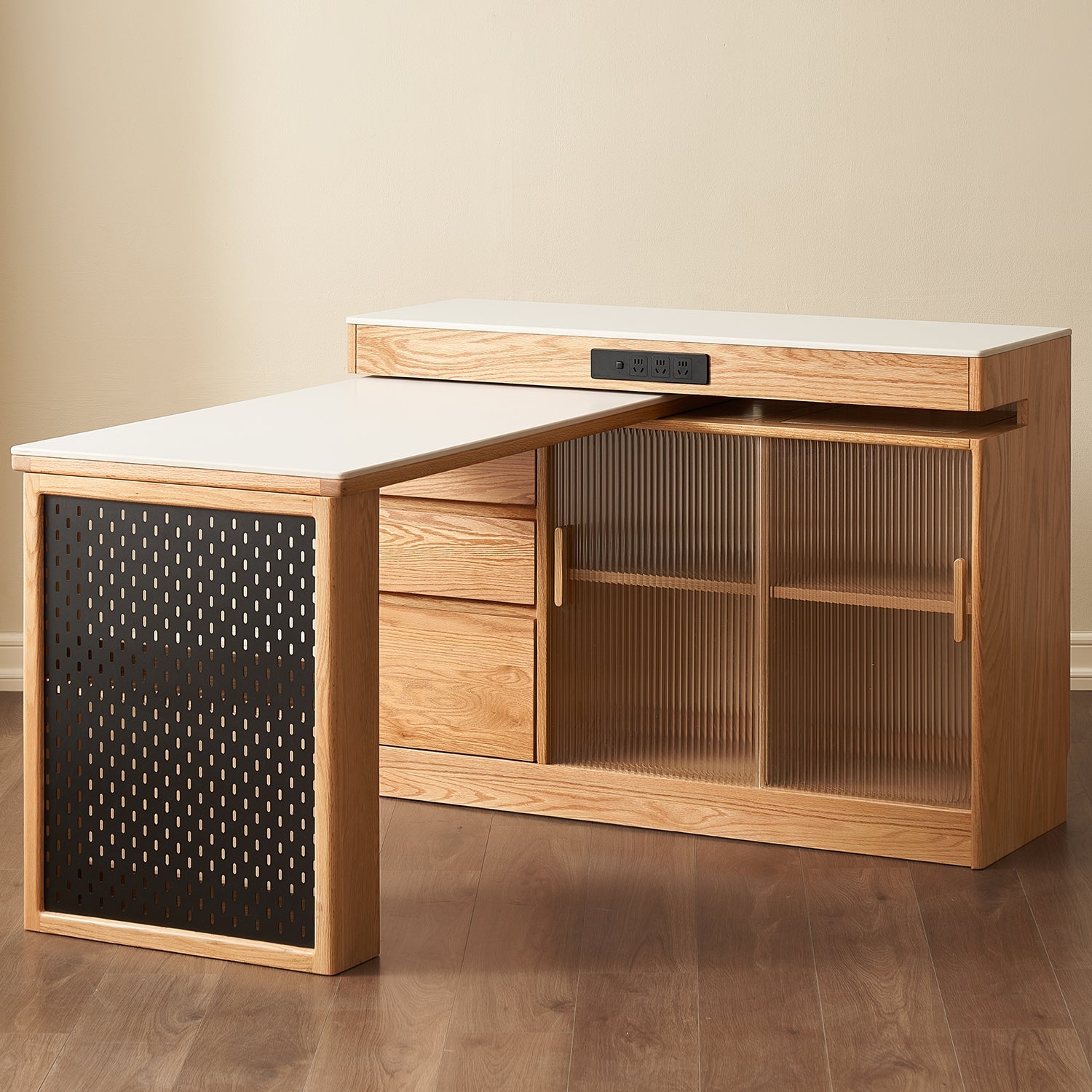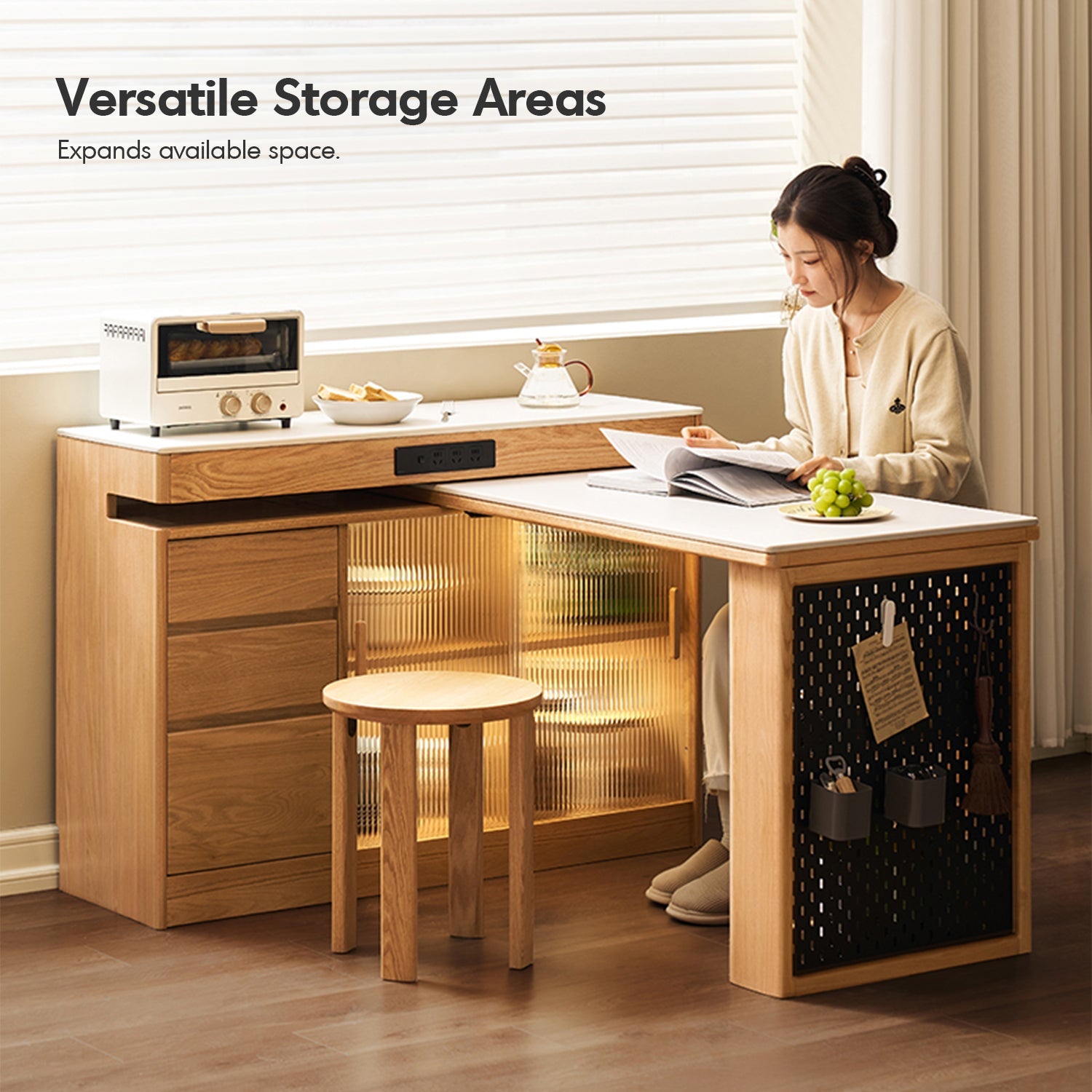 Scandinavian Oak Wood Sintered Stone Extendable Island Dining Table With Cabinet MODUCAB offers a flexible layout, storage, and sleek design for modern homes.