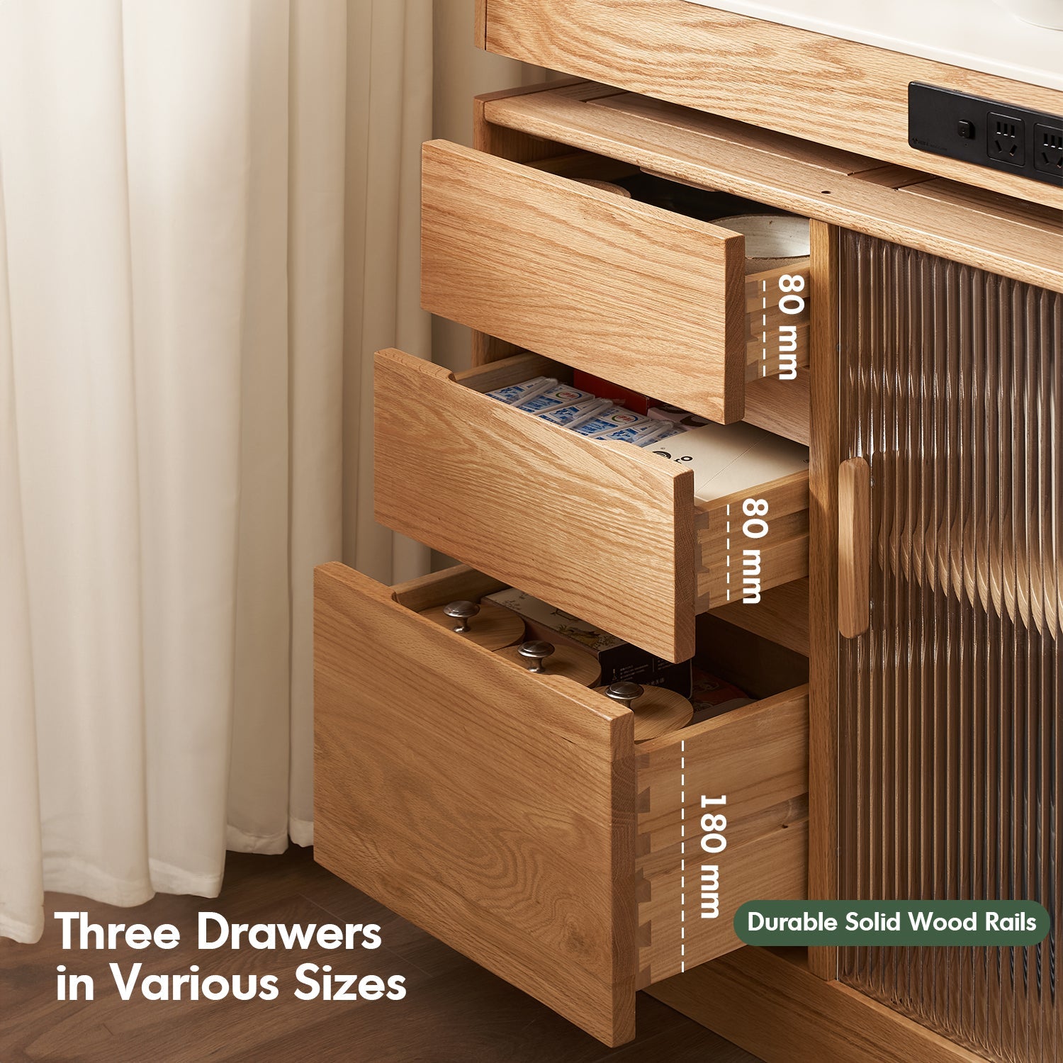 Includes textured glass sliding cabinets, adjustable shelves, and recessed handles for sleek, organized storage. |