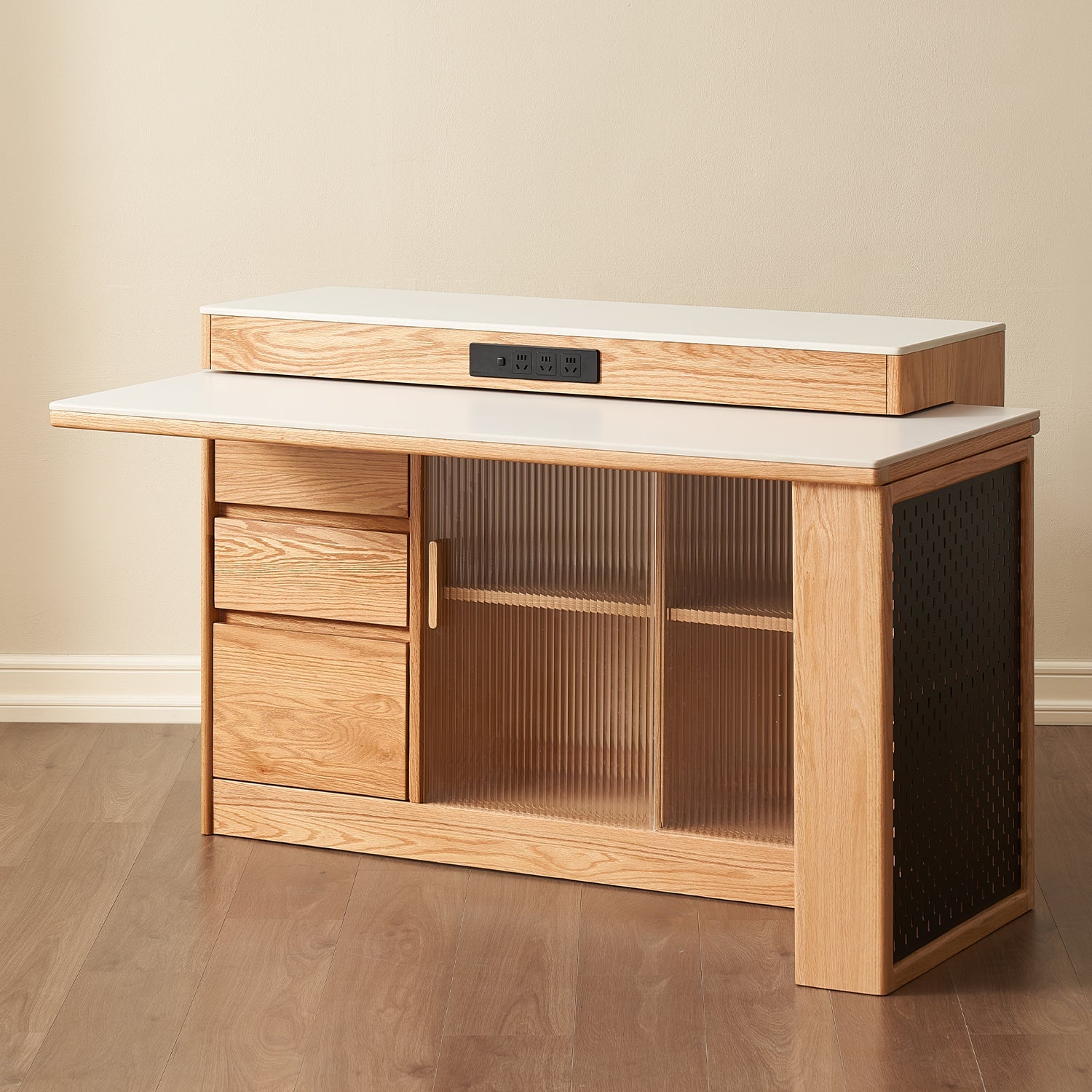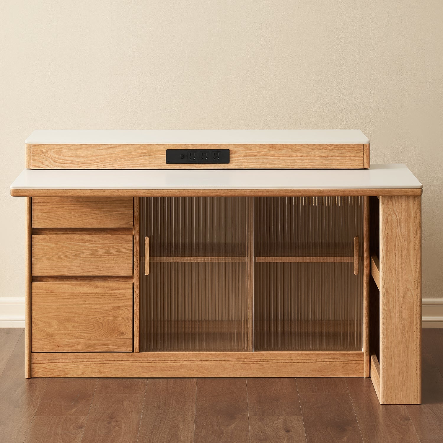 Scandinavian Oak Wood Sintered Stone Extendable Island Dining Table With Cabinet MODUCAB