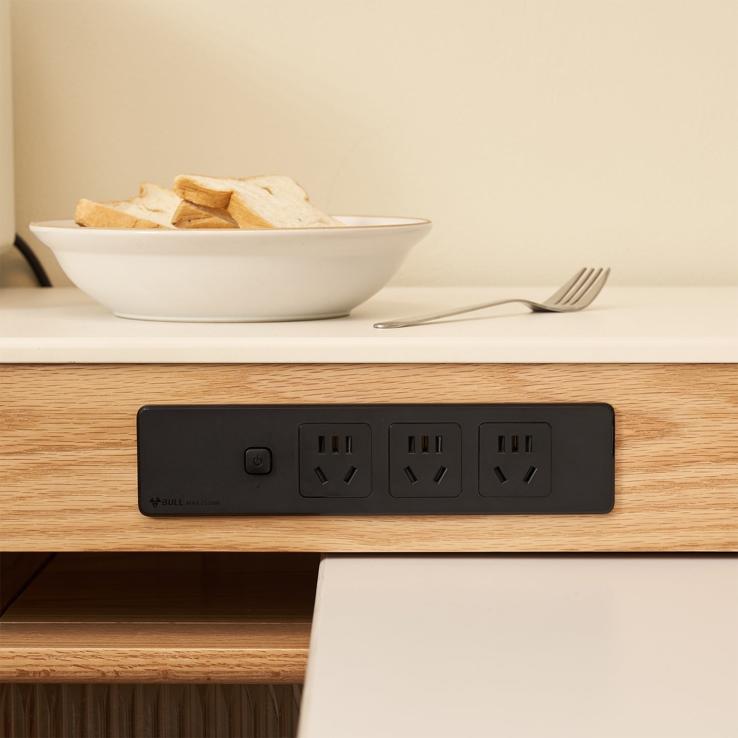 Prevents power outlet obstruction when placed against a wall for seamless utility integration. |