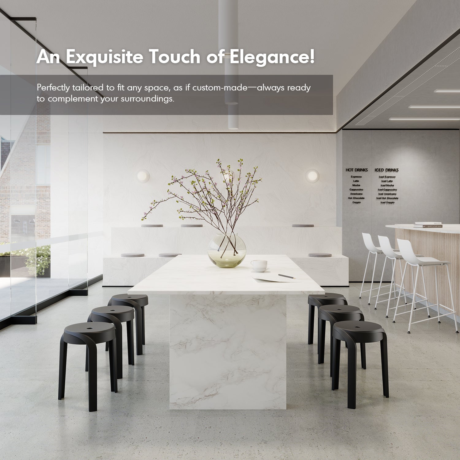 The Modern Plastic Stackable Dining Stool WHIRL (4pcs Set) features a dynamic design inspired by a hurricane, adding style and elegance to any space. Crafted from durable, non-toxic PP material, it offers stability and safety. The stackable design ensures easy storage, while the ergonomic concave seat provides comfort. Perfect for compact spaces, it combines function with modern aesthetics seamlessly.