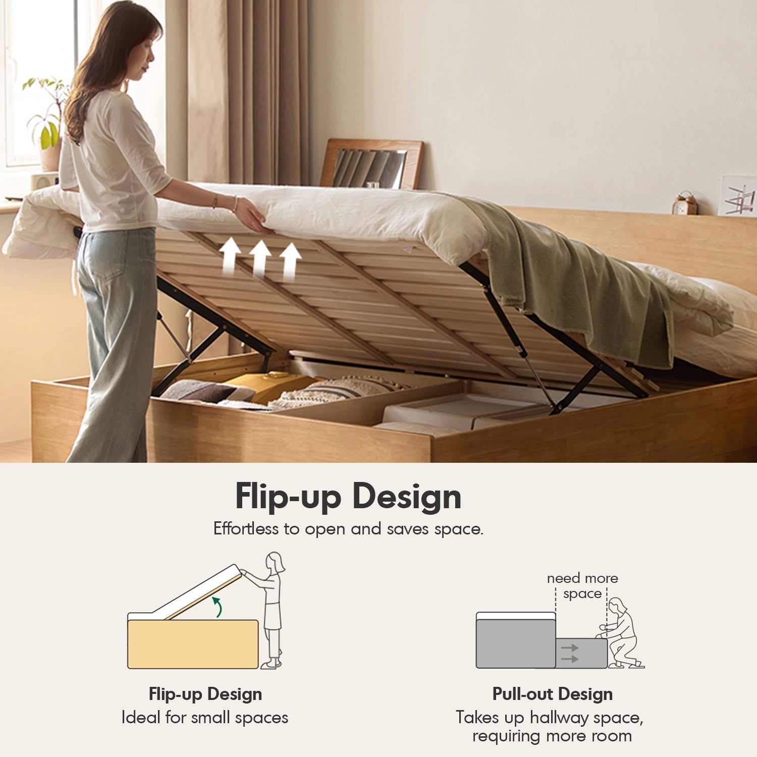 Scandinavian Rubber Wood Storage Bed BASE combines style, functionality, and comfort. It's perfect for organised living with half-opening footboard storage featuring two compartments and a hydraulic gas lift for effortless access. The ergonomic reclined headboard offers superior comfort, while the functional design includes a headboard with storage and an extended shelf for seamless placement. It is built with solid wood slats and a sturdy frame to ensure lasting stability. ï¿