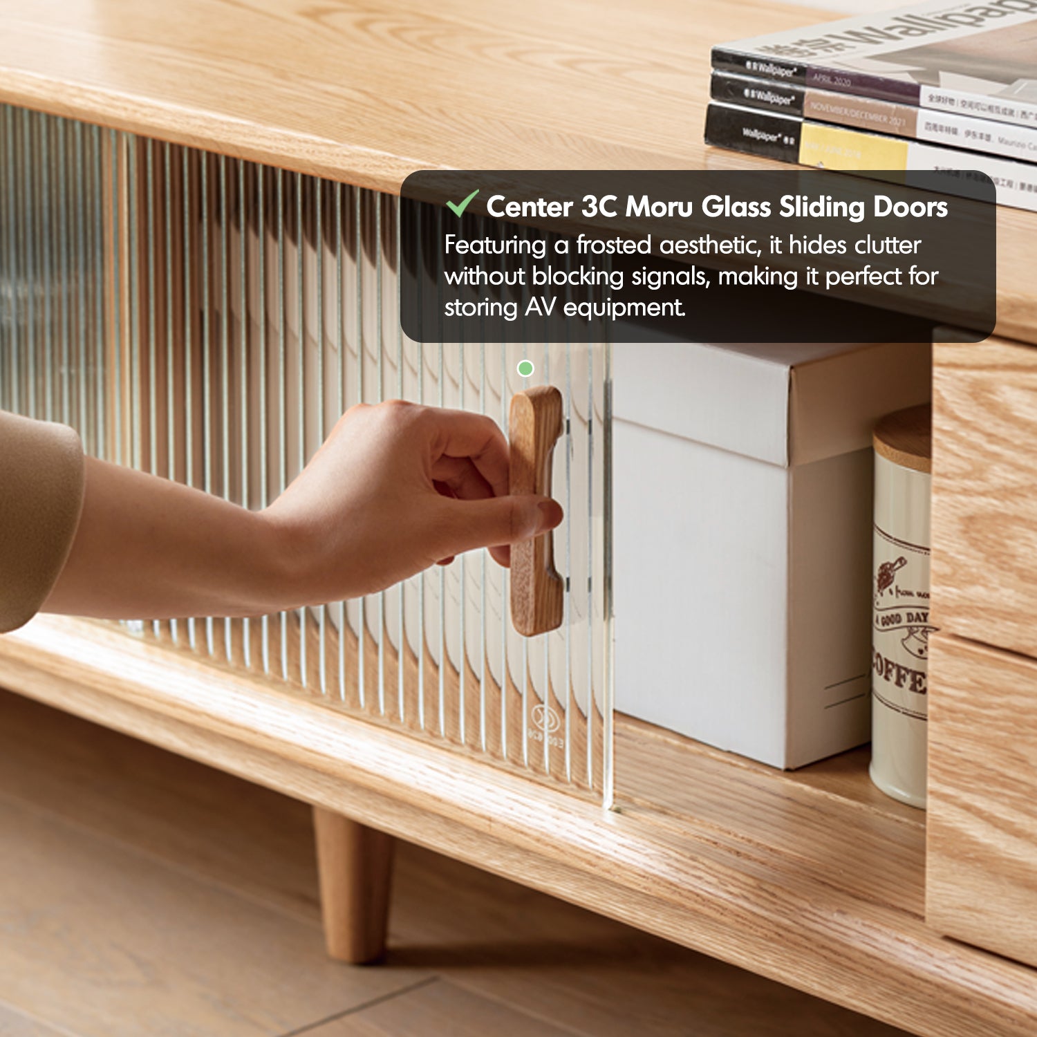 The Scandinavian Oak Wood Moru Glass TV Console VISTA combines sleek modern design with exceptional functionality. Featuring 3C Moru glass doors, enhanced storage, efficient cable management, and a solid oak build, it's the perfect blend of style and practicalit
