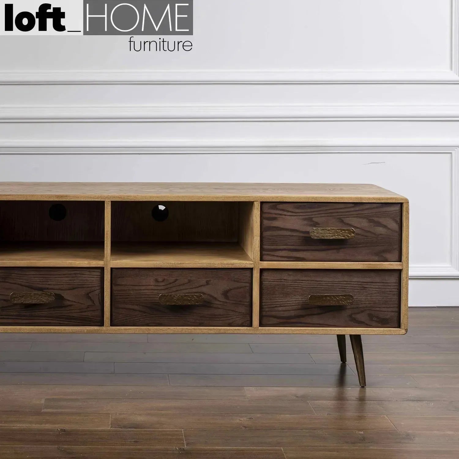 | Material: | Ash wood TV console with black powder coated steel legs and brass handles. |