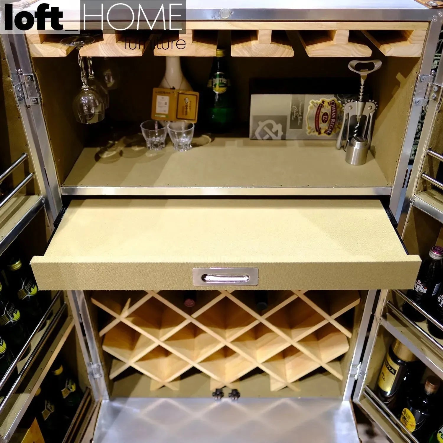 This piece serves a useful purpose and, at the same time, brings an industrial touch to this piece while offering wine bottles some sort of protection. Canvas is used all over to provide the design with more depth and texture. Industrial Aluminium Wine Cabinet, with its unique and refined features, can help you forget about your surroundings at any room in the world on this industrial grace.