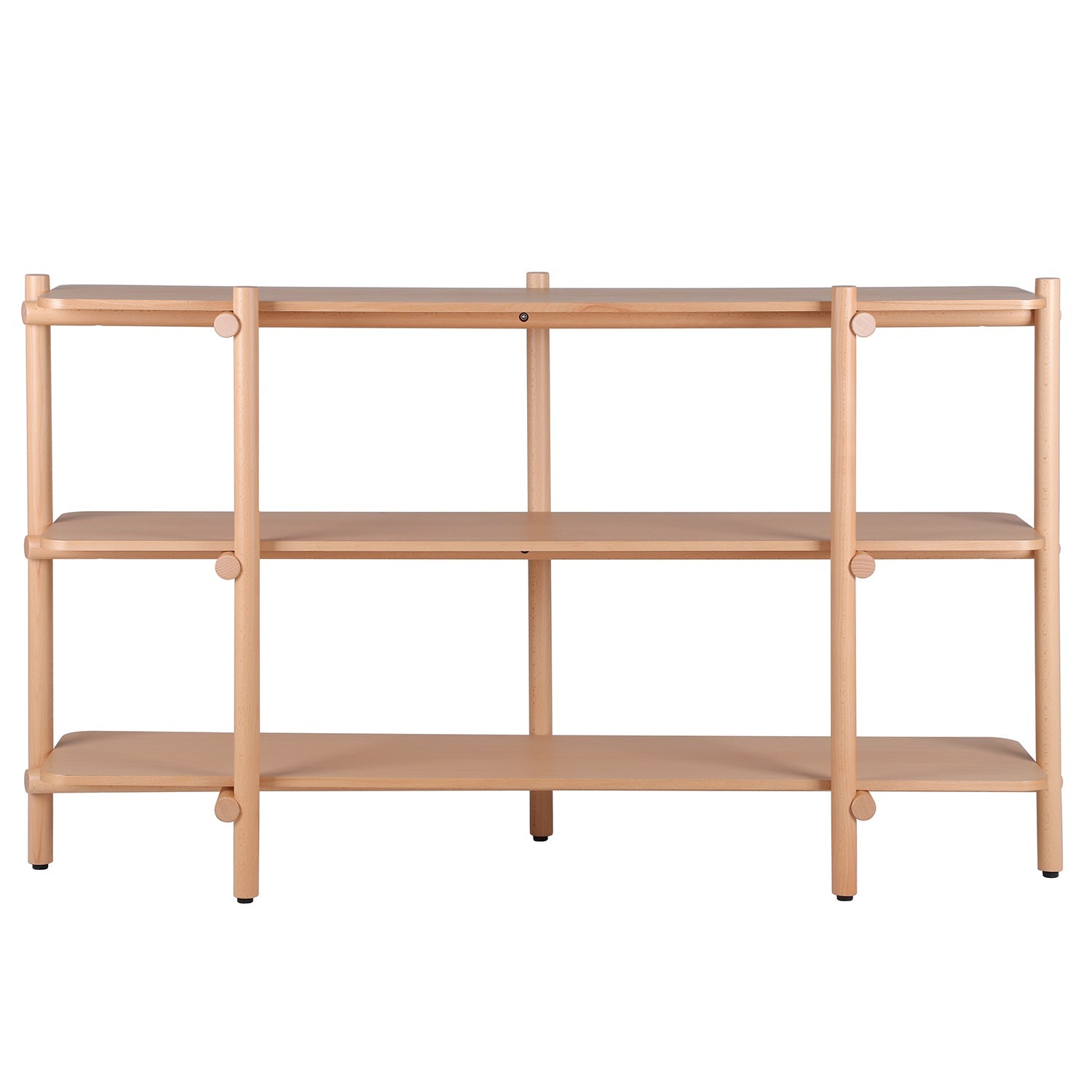 Scandinavian Beech Wood Side Shelf HILDA is crafted with solid birch wood shelves and a beech wood frame, showcasing beautiful natural grain patterns. The three-tier design, complemented by cross mortise and tenon joinery, adds both elegance and practicality to any room.