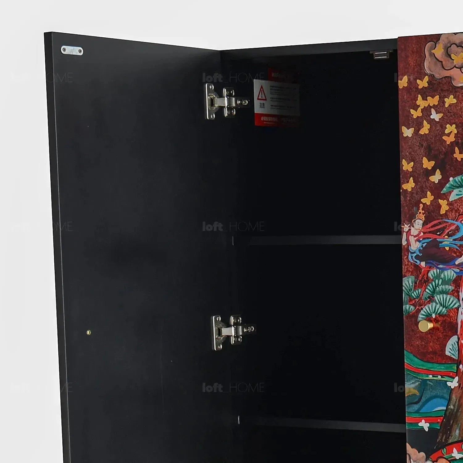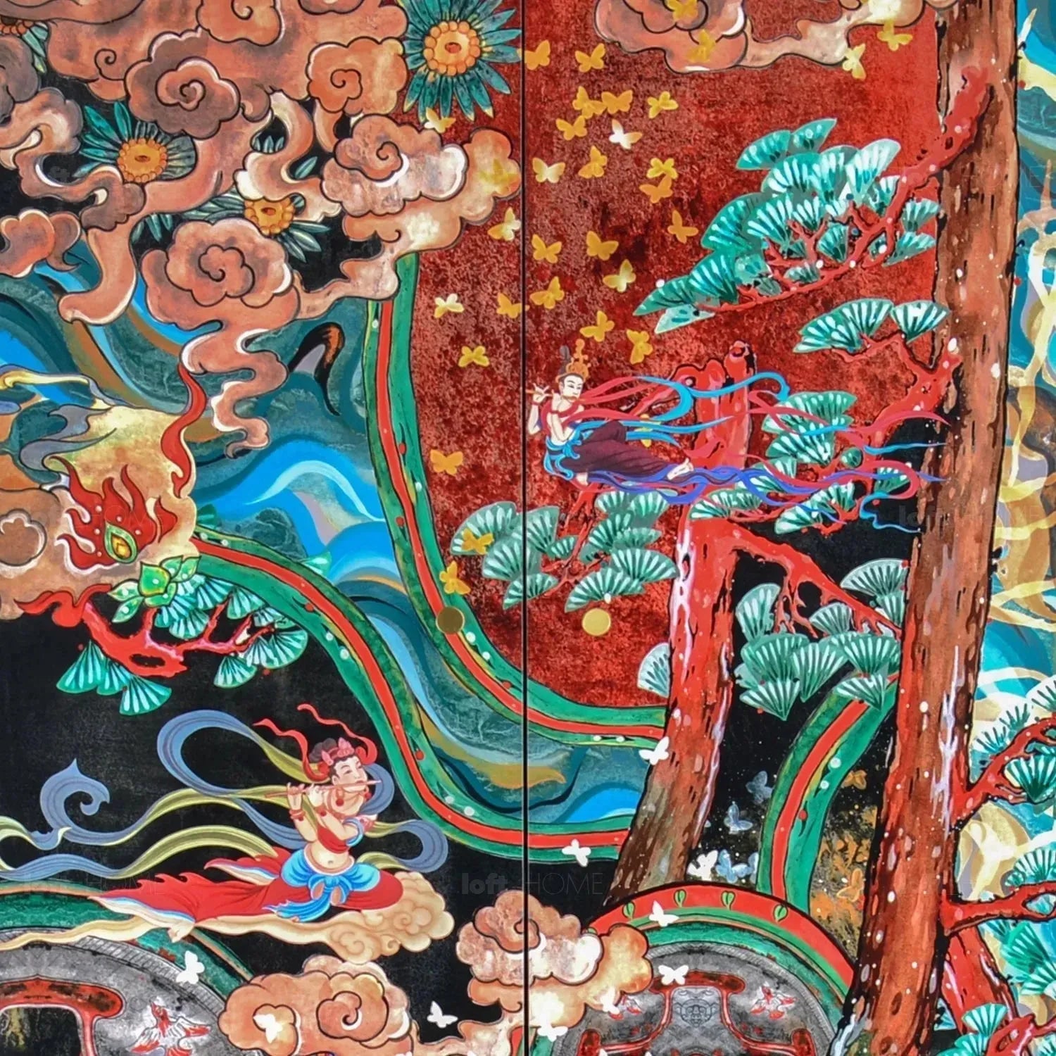 The beauty of our Eclectic Wood Storage Cabinet lies in the solidity and elegance highlighted by lacquer finish craftsmanship. Admire the beauty of every door's hand-painted artwork that frames each eco friendly engineered wood panels. It sports unique handles fashioned from aventurine brass that make the whole design look more sophisticated and very elegant.