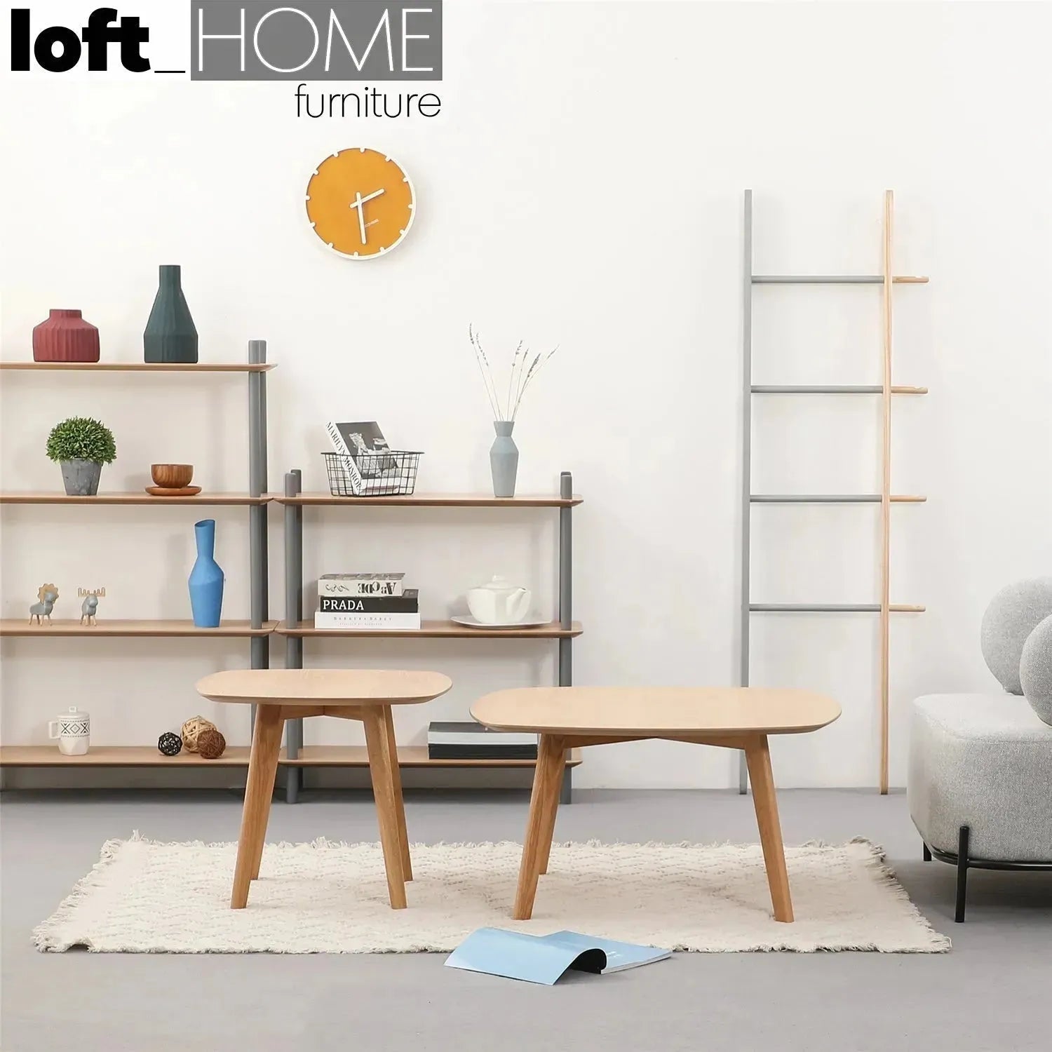 Solid oak legs with a thick-layered warm orange coating are L550 x W550 x H470 mm. Its scratch-resistant surface assures durability and makes it a stylish, handy accomplice in meeting everyday needs. It has a well-balanced size that can fit just about anywhere, and because it is made of solid oak legs supporting oak veneer plastic laminate panels, it enhances the modernity of its environment.