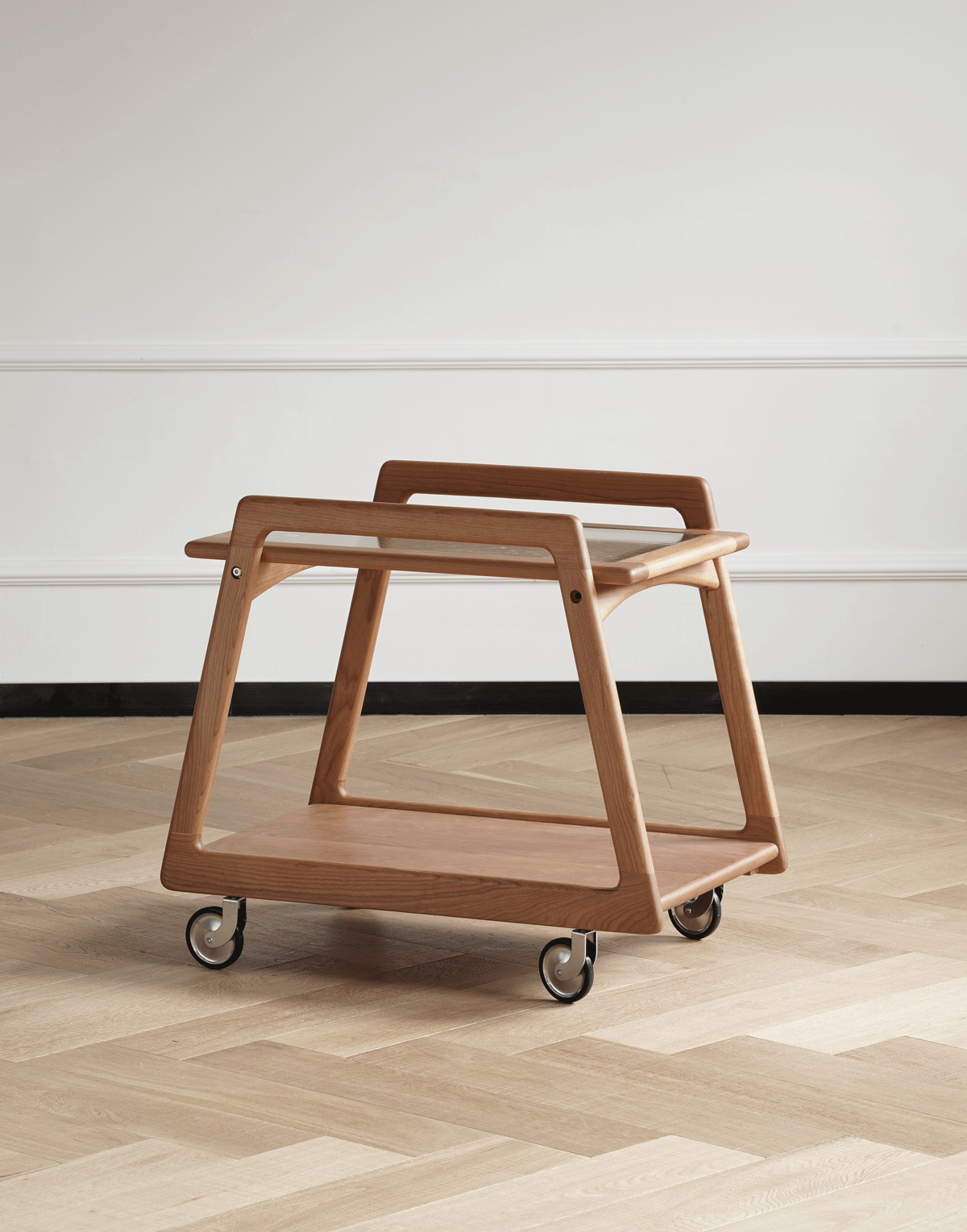 Scandinavian Cherry Wood Wheeled Trolley Side Table YOYO combines smooth mobility, warm cherry wood, and compact storage to elevate everyday living with flexible style and function
