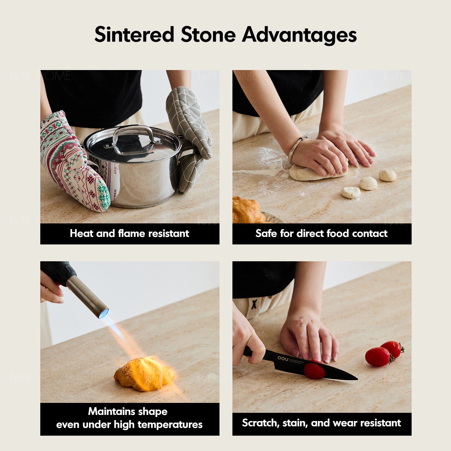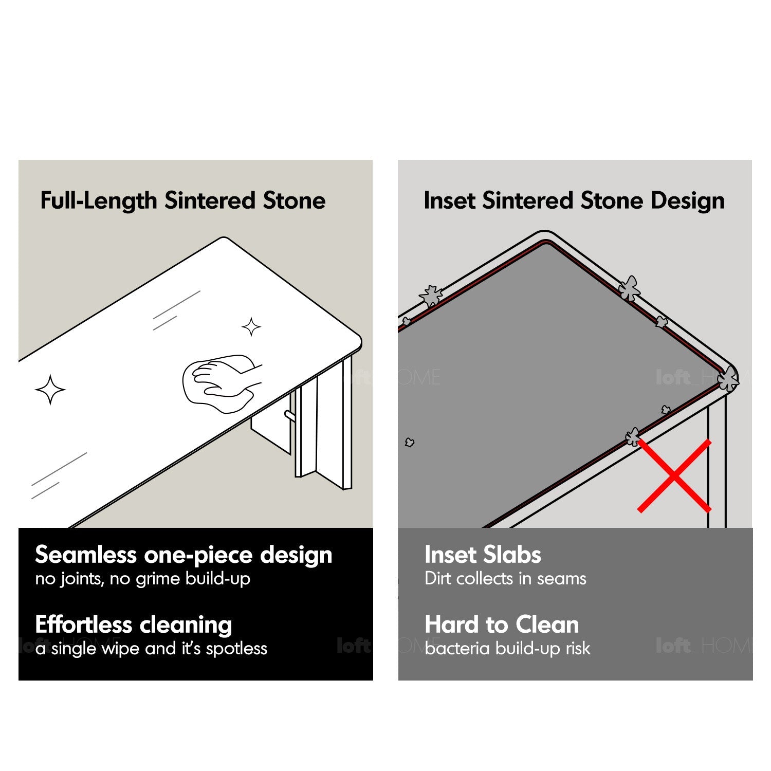 A full-length sintered stone top with no joints—easy to clean, hygienic, and beautifully refined.