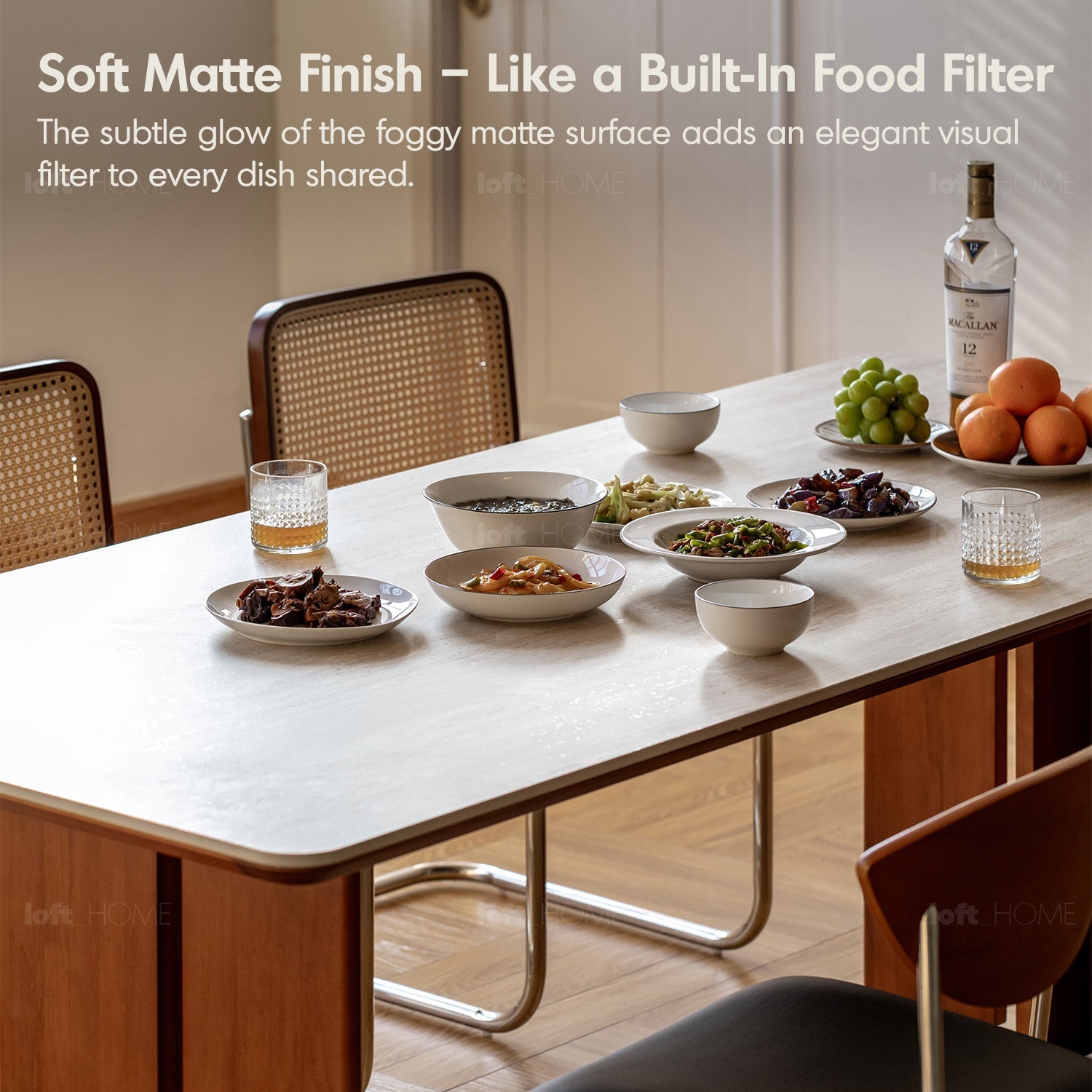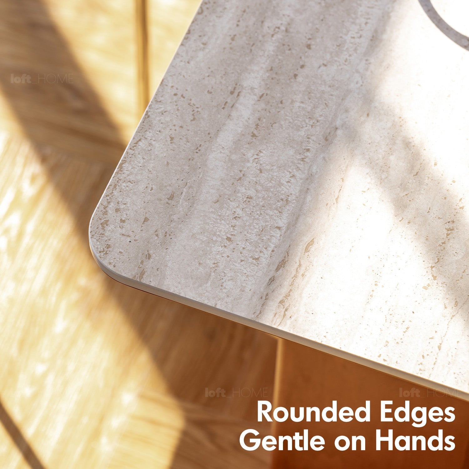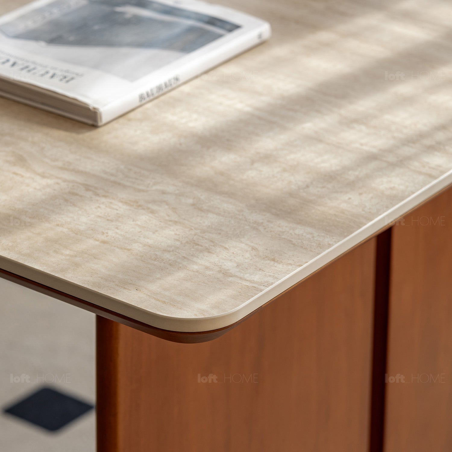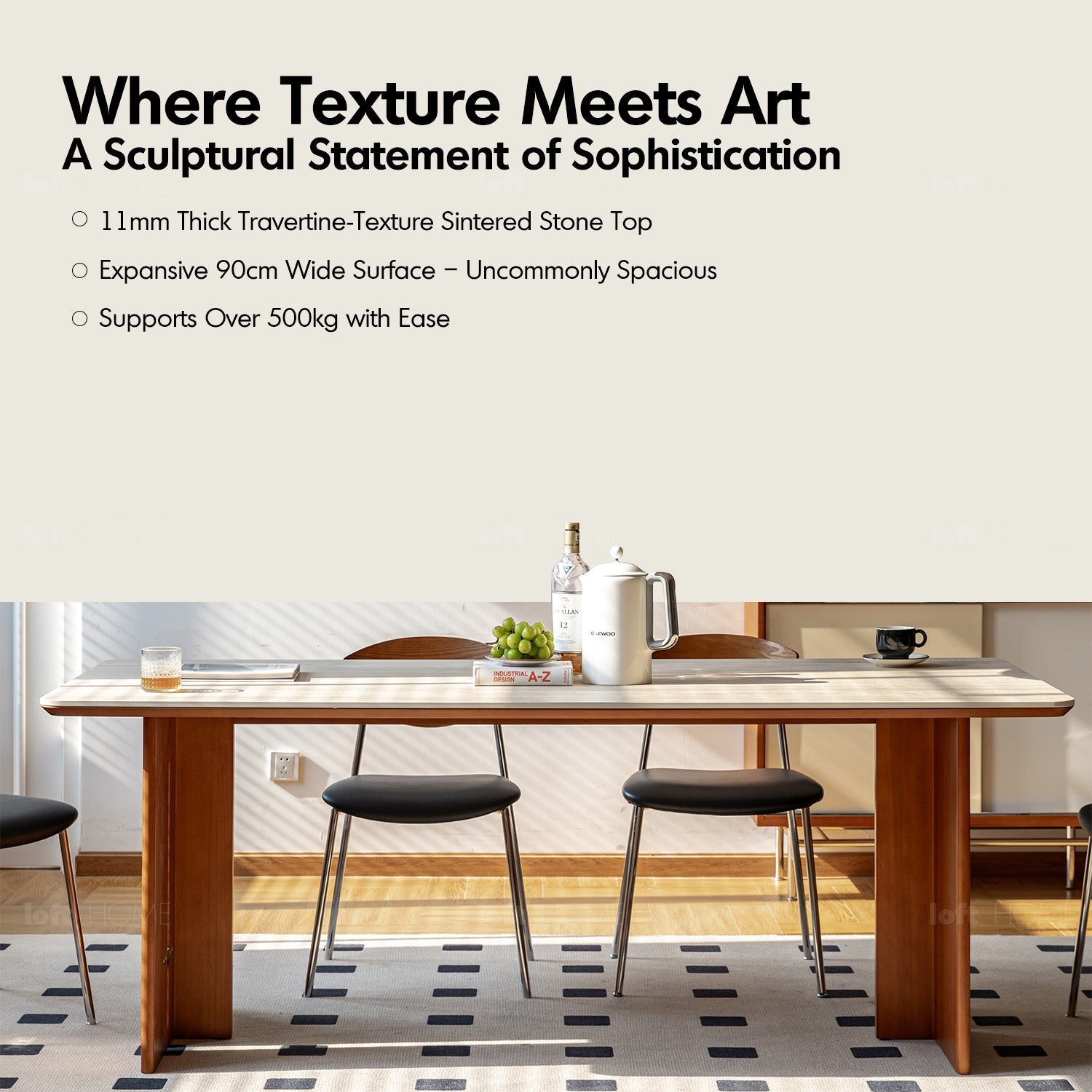 Featuring travertine-textured sintered stone and soft matte finish, adding timeless luxury to your dining or workspace.