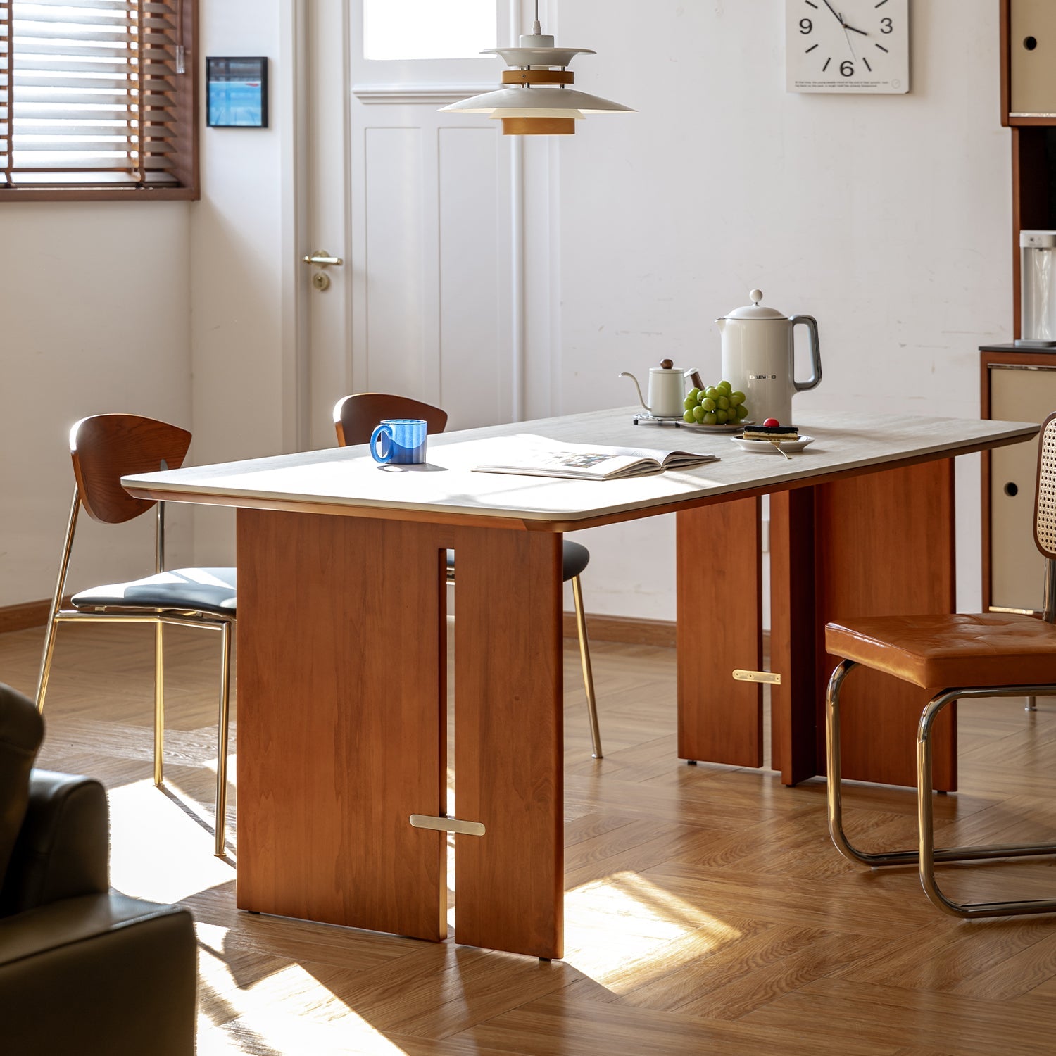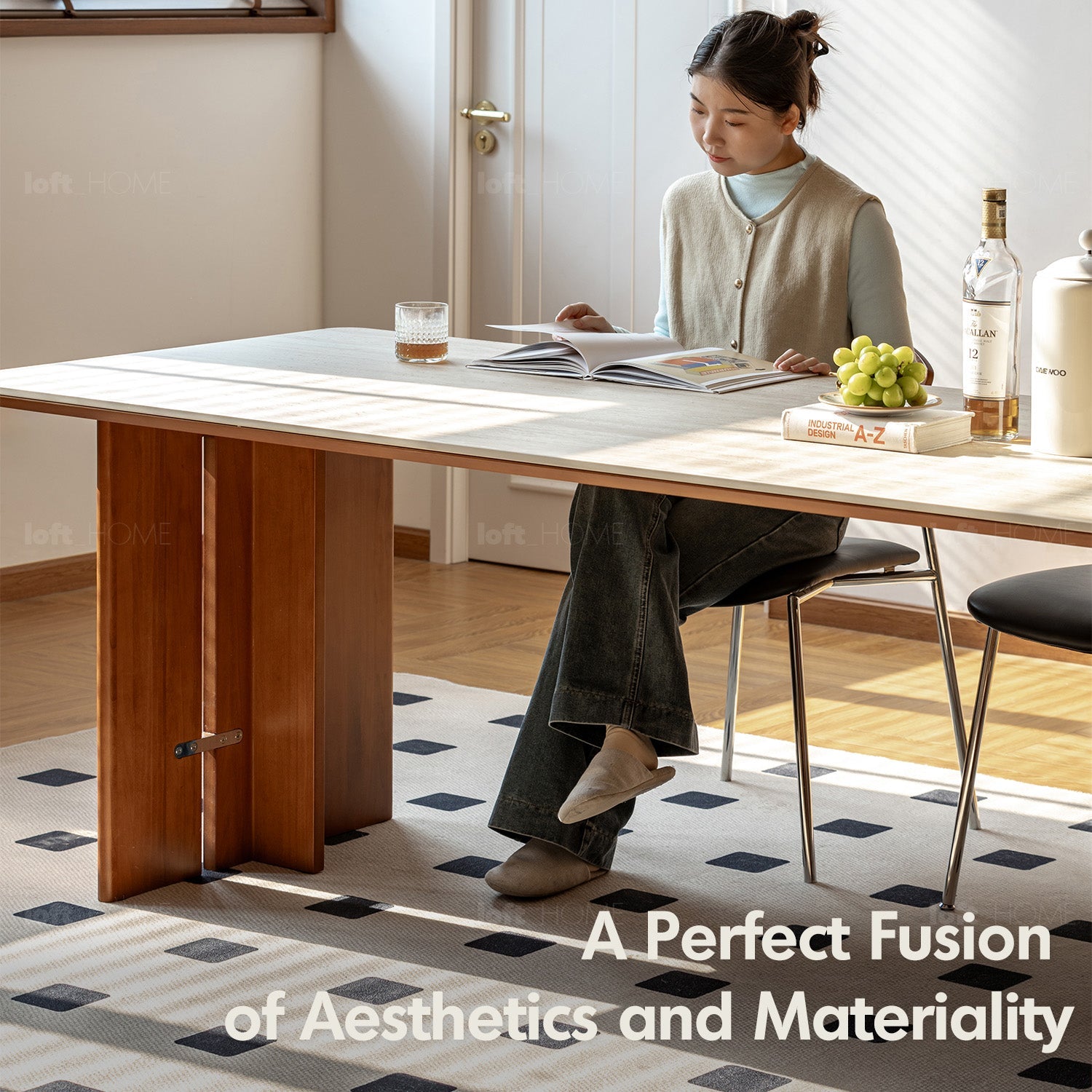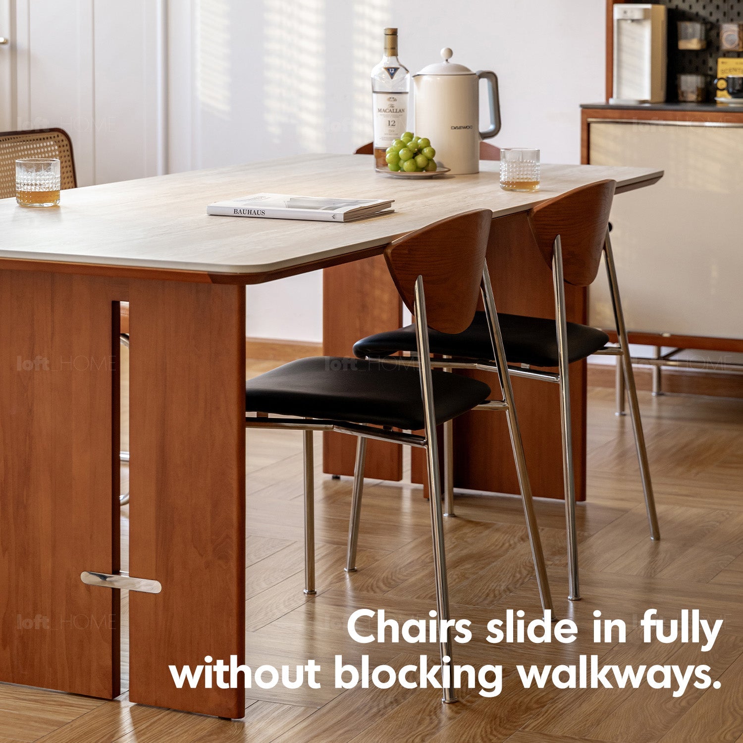 Featuring travertine-textured sintered stone and soft matte finish, adding timeless luxury to your dining or workspace.