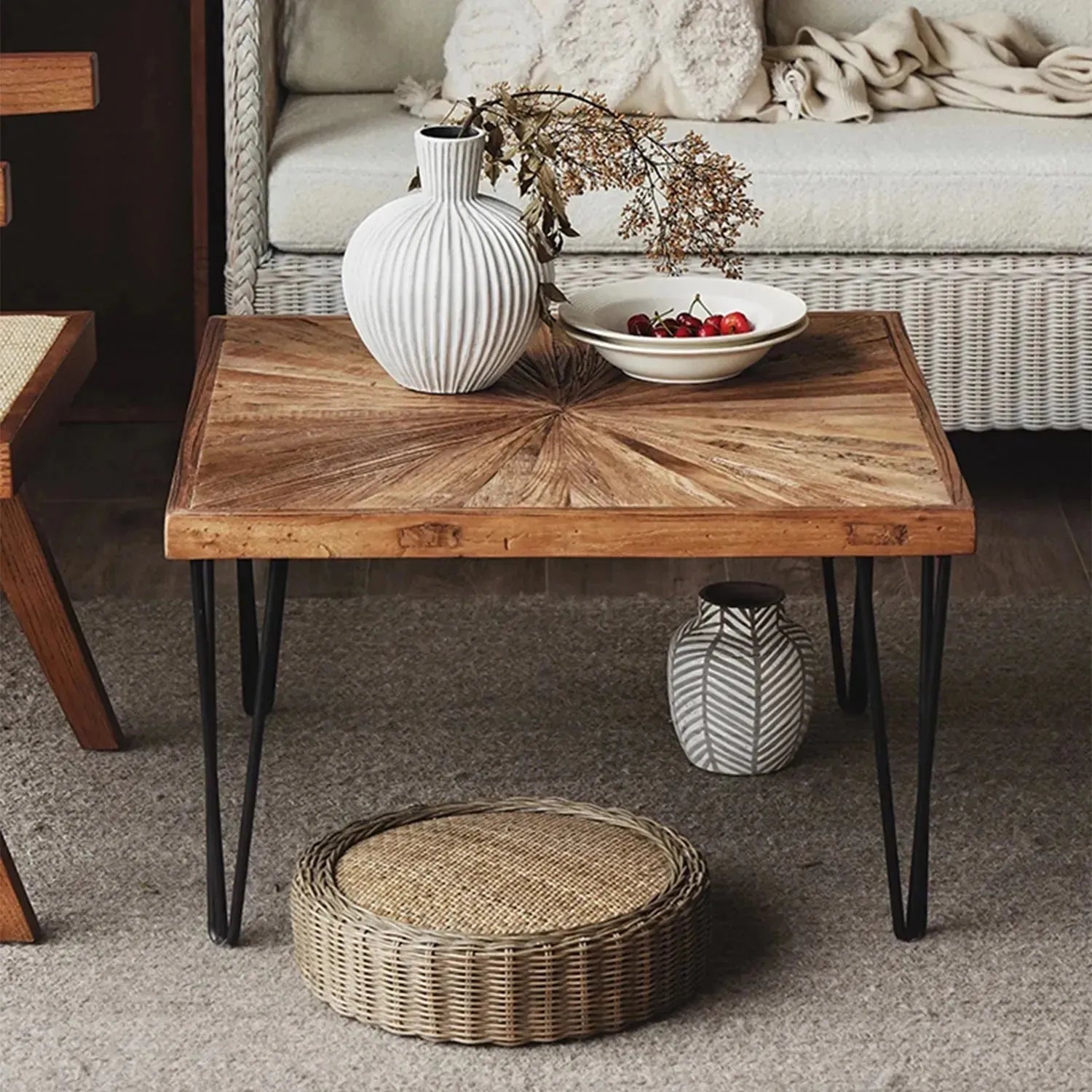 Rustic Elm Wood Square Coffee Table satisfies your needs in the situation when you imagine such a perfect coffee table. L700 x W700 x H400 mm, this table delivers the ideal compromise between usefulness and room. Industrial touch and rustic design are both present on the coffee table with powder-coated metal legs. This makes the table look stylish and sleek and also gives more stability.