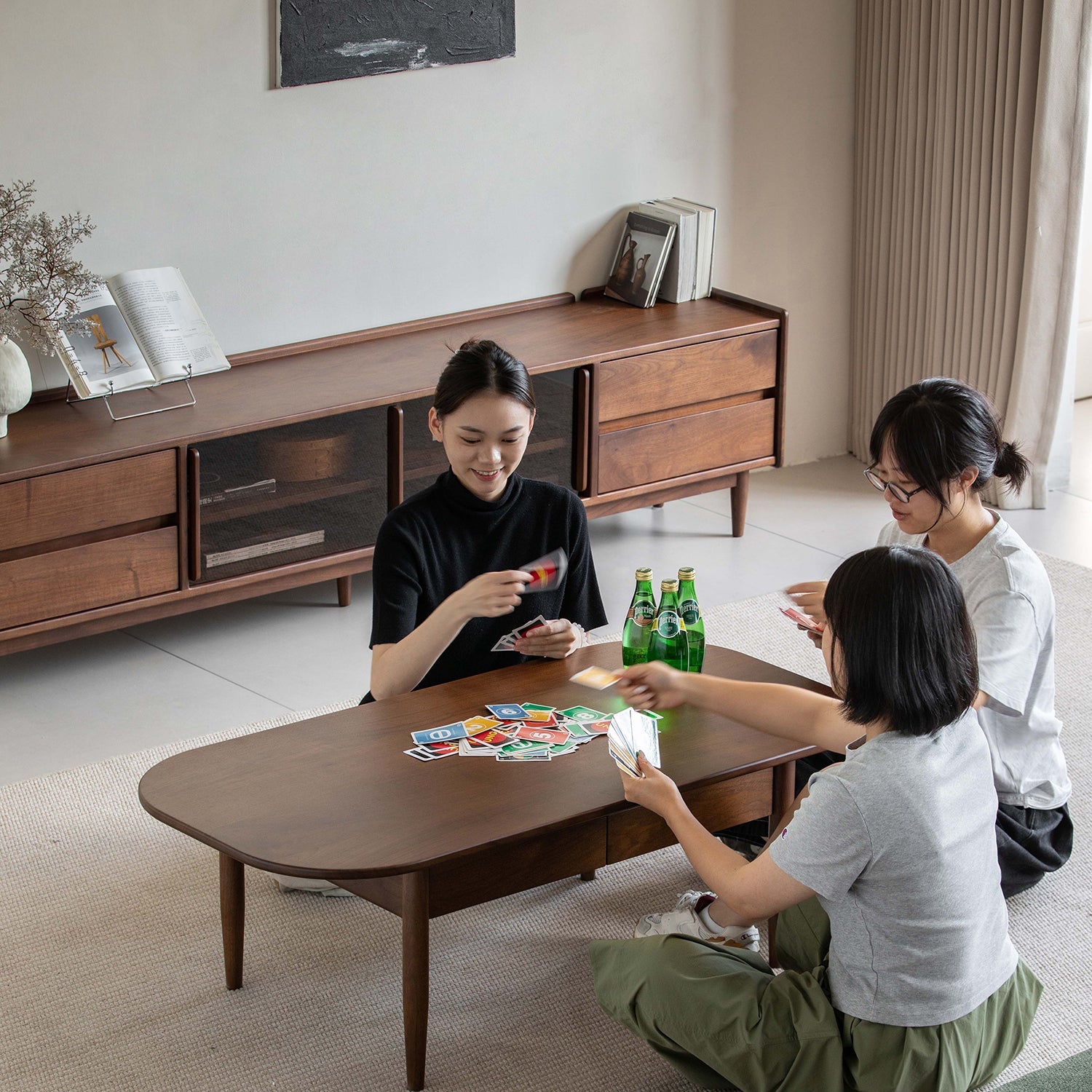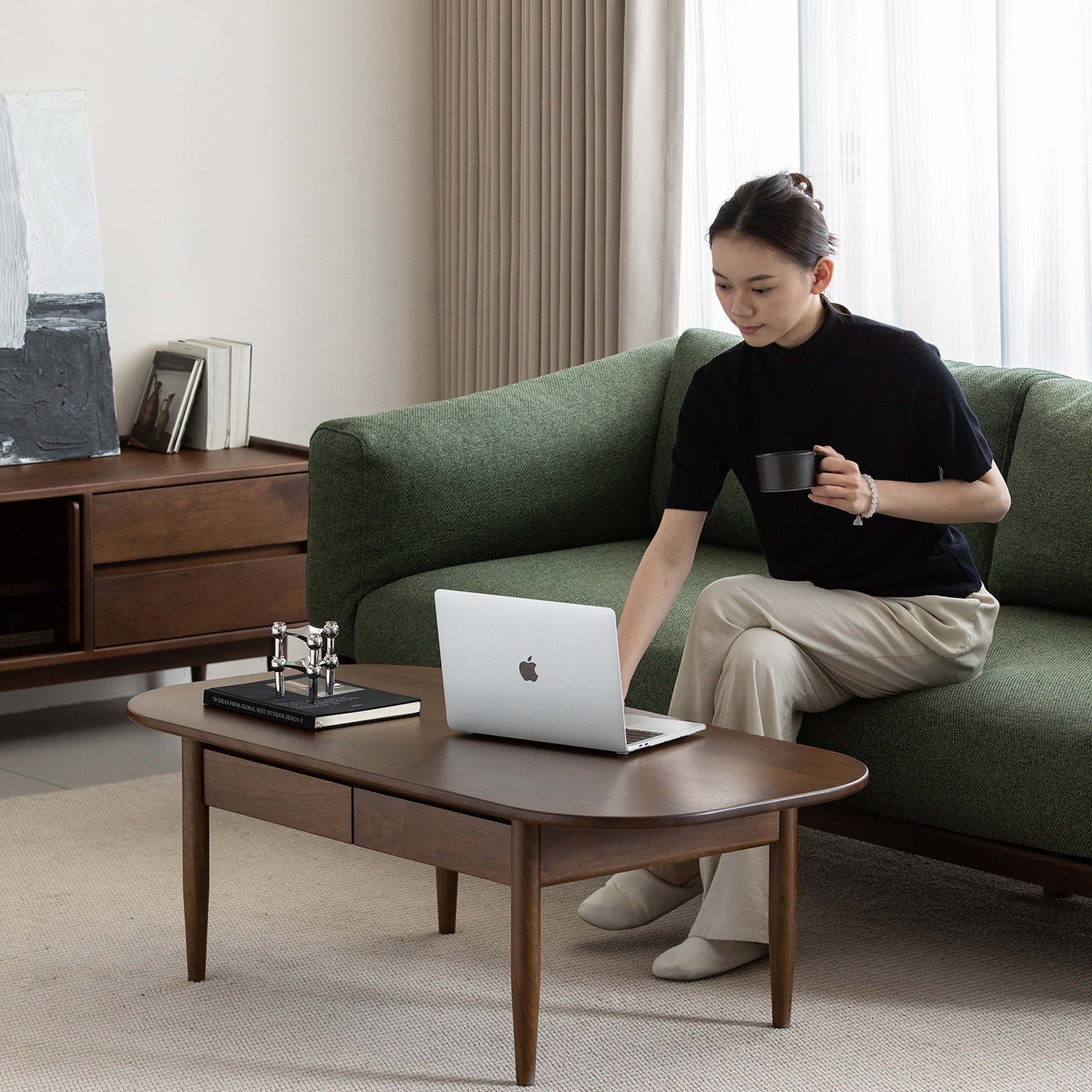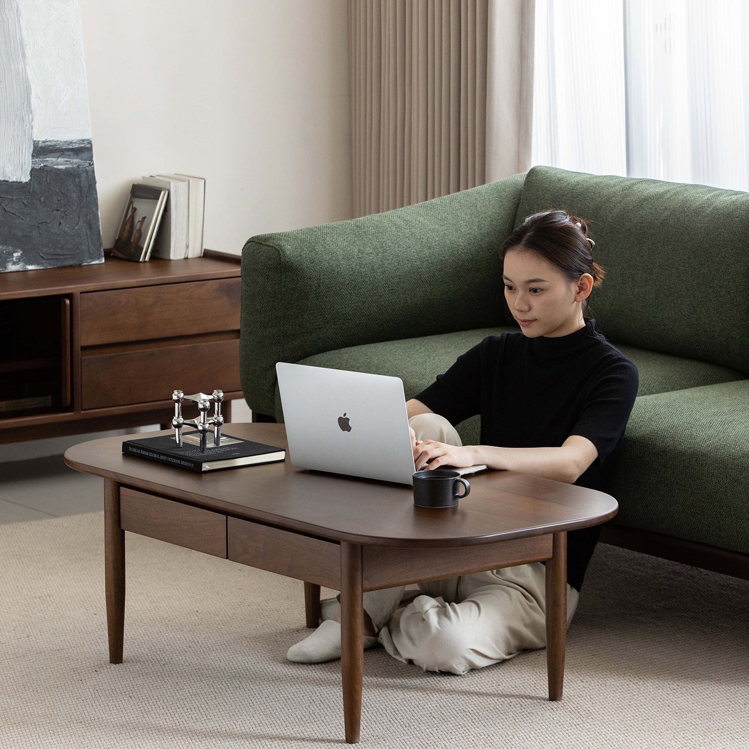 The coffee table is crafted from solid walnut wood, valued for its rich tone and strong structure, offering a dependable surface that feels premium and reassuring for everyday use. |