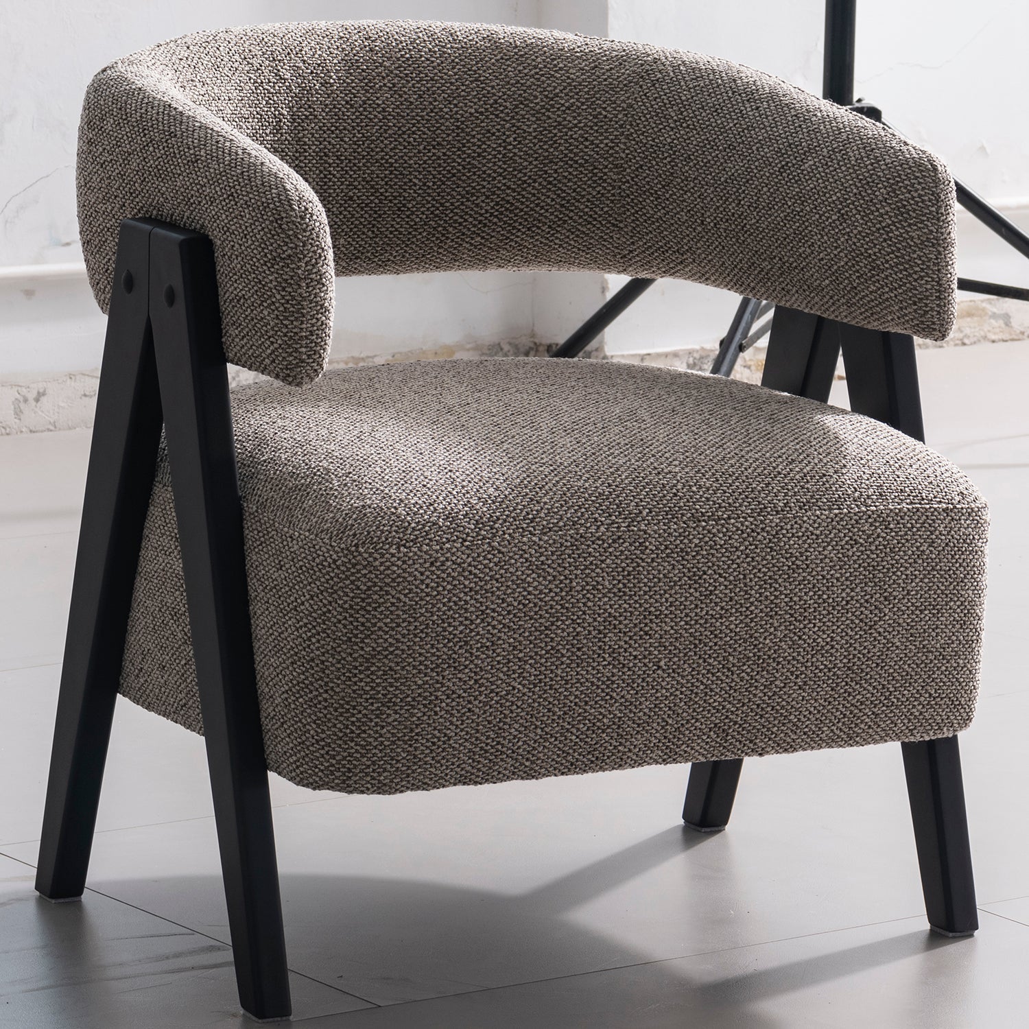 Modern Boucle Fabric 1 Seater Sofa COLLE combines modern design with cozy comfort. Featuring a durable rubberwood frame and luxurious boucle fabric upholstery, this chair provides a plush, medium-soft seating experience with high-density foam filling. The stylish black V-shaped legs add a touch of sophistication, while the chair is available in two color options: white and grey. Perfect for adding a chic, contemporary element to any room.