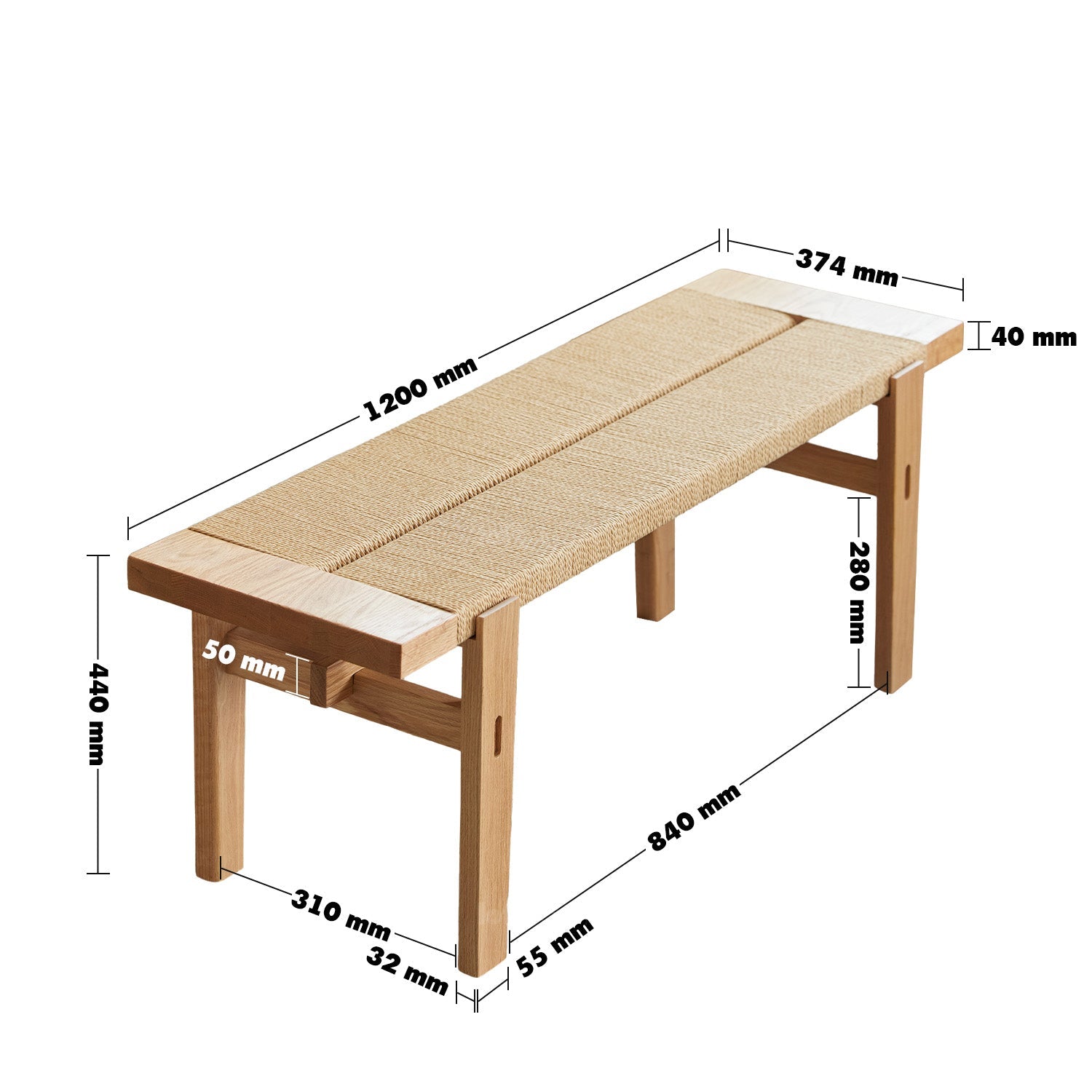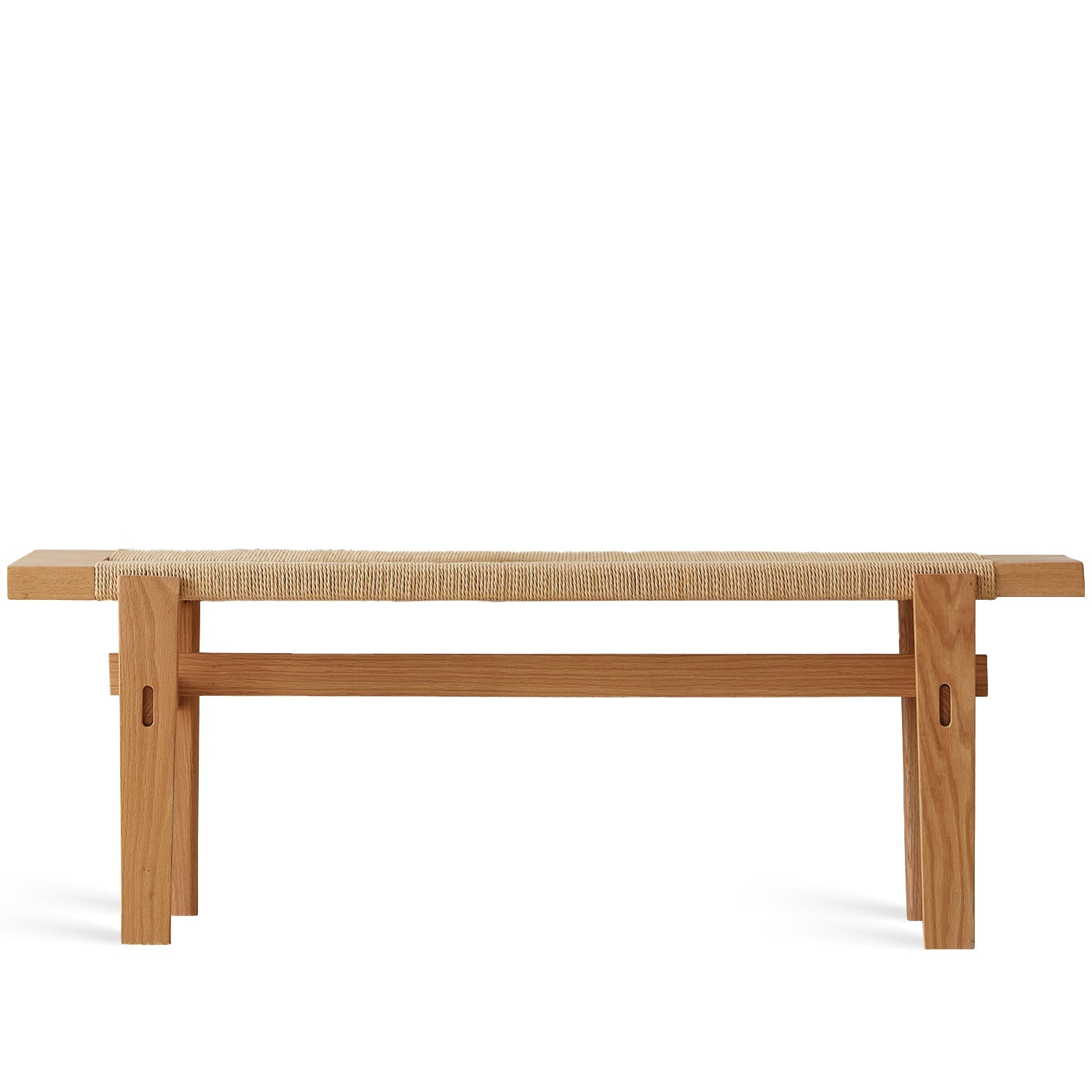 Scandinavian Oak Wood Woven Rope Dining Bench ORA blends traditional mortise and tenon craftsmanship with a breathable handwoven rope seat. Its solid wood frame, unique leg design, and generous dimensions offer durability, style, and versatility for any space.