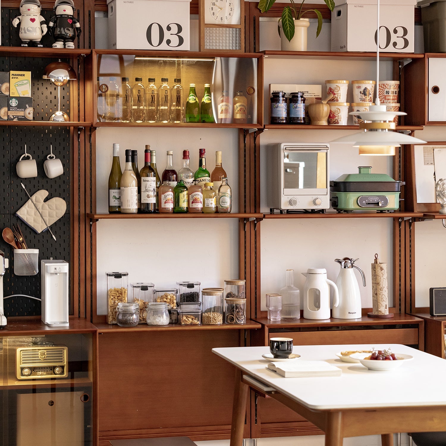 Add hanging rails and breathable pull-out baskets for flexible dining or pantry storage.