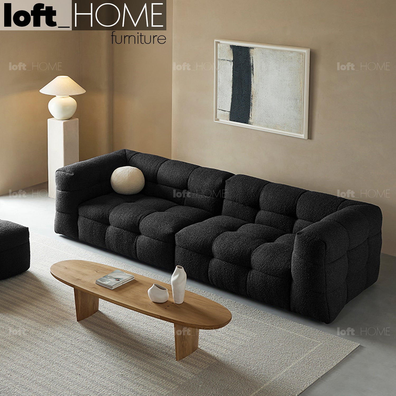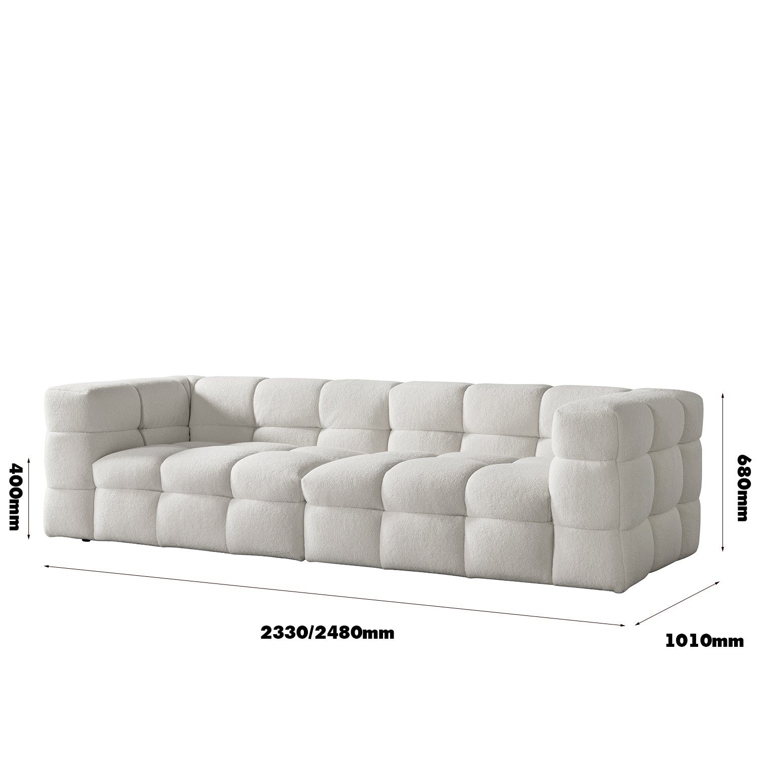 Our living room sofa, made for three seats and measuring L2400xW1100xH720 mm, will perfectly suit you and your family by giving you the space to chill out and relax in perfect luxury. The Boucle Fabric upholstery adds a more relaxed and worry-free experience.