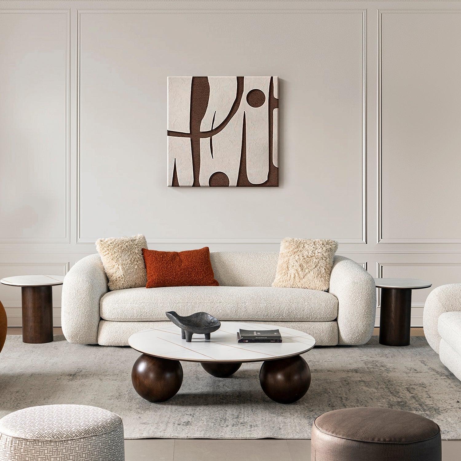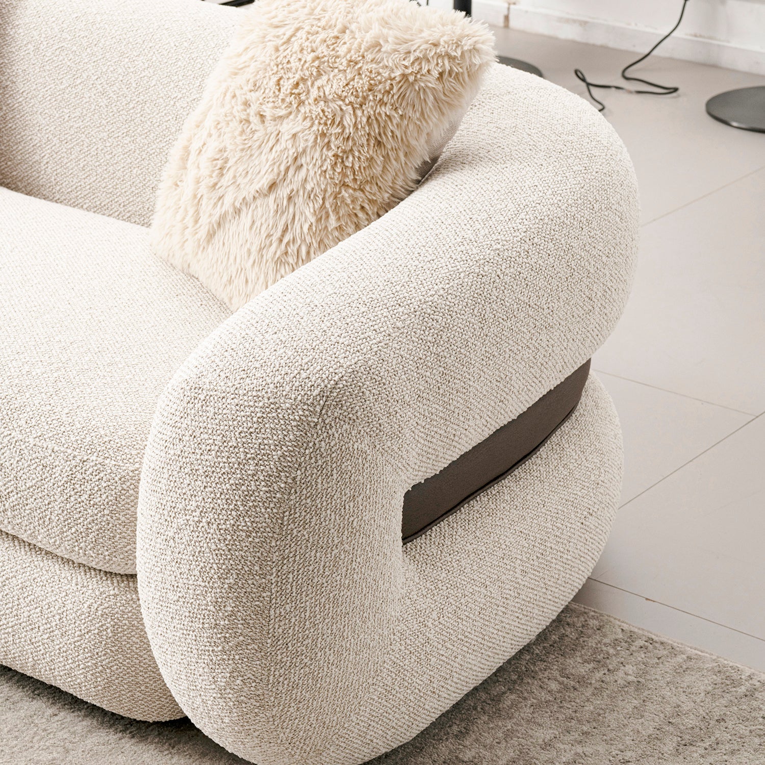 Cream Boucle Fabric 3 Seater Sofa CURLY blends soft curves, bouncy foam, and colorful cushions ideal for playful comfort in modern living rooms.