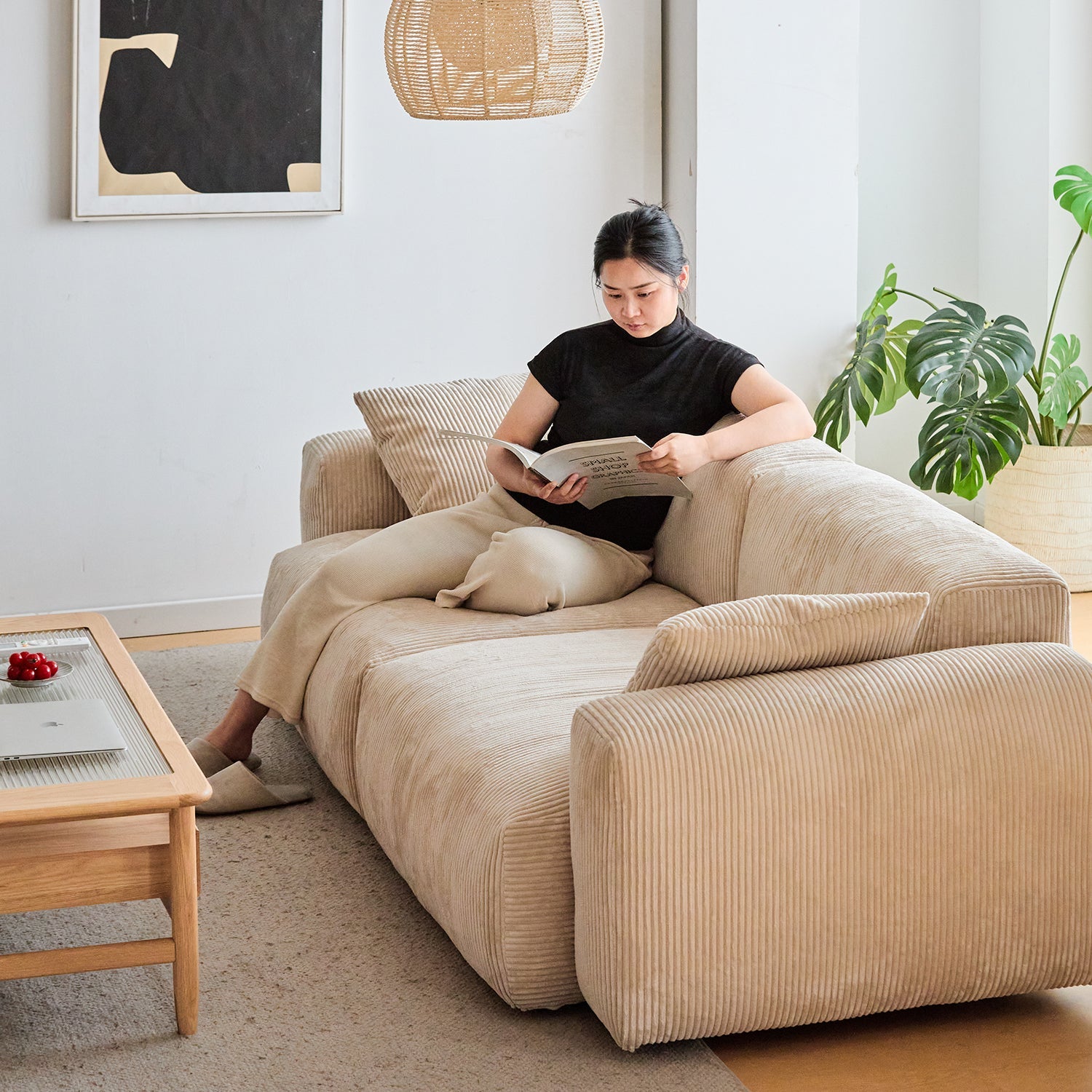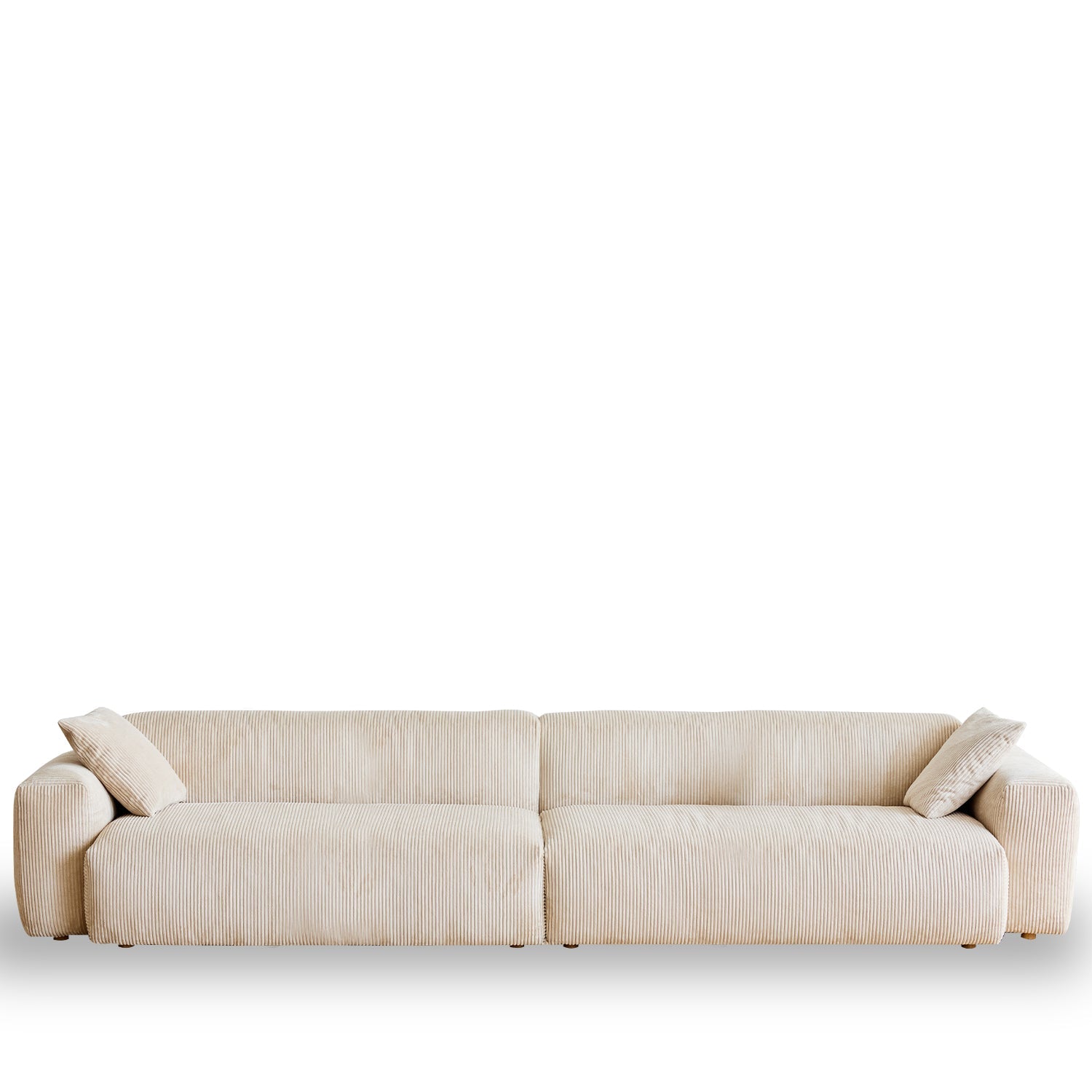 Cream Corduroy Velvet Fabric 4 Seater Sofa SQUARE offers timeless beauty with ultra soft velvet fabric and spacious seating for elevated everyday living.