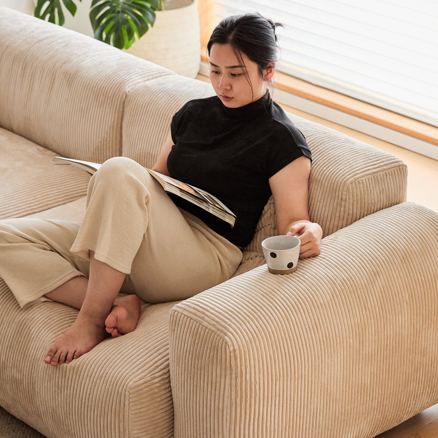 Cream Corduroy Velvet Fabric 4 Seater Sofa SQUARE
