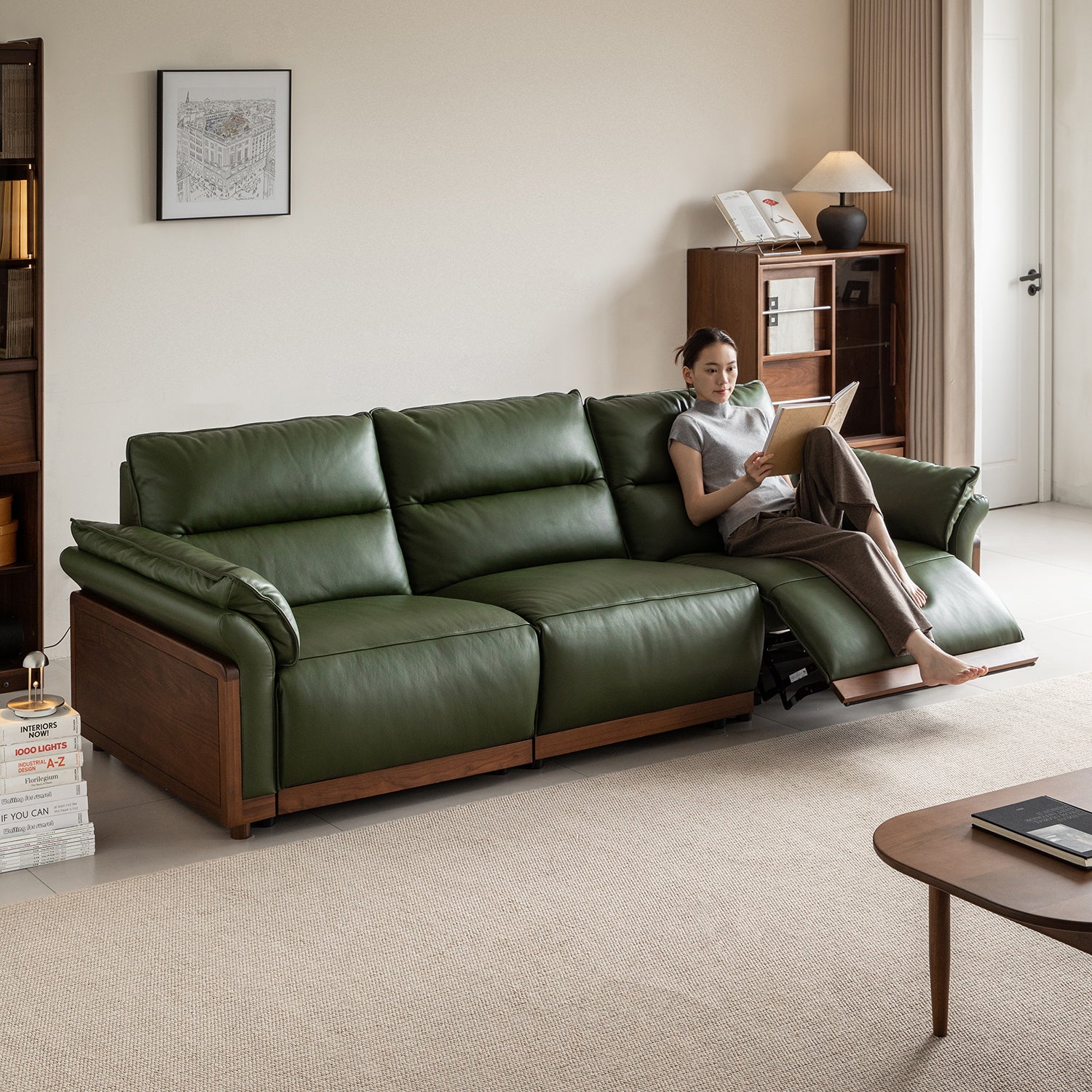 Japandi Walnut Wood Genuine Leather Electric Recliner 4 Seater Sofa EDGELESS brings smooth electric reclining and genuine leather comfort with Japandi walnut warmth for refined modern living.