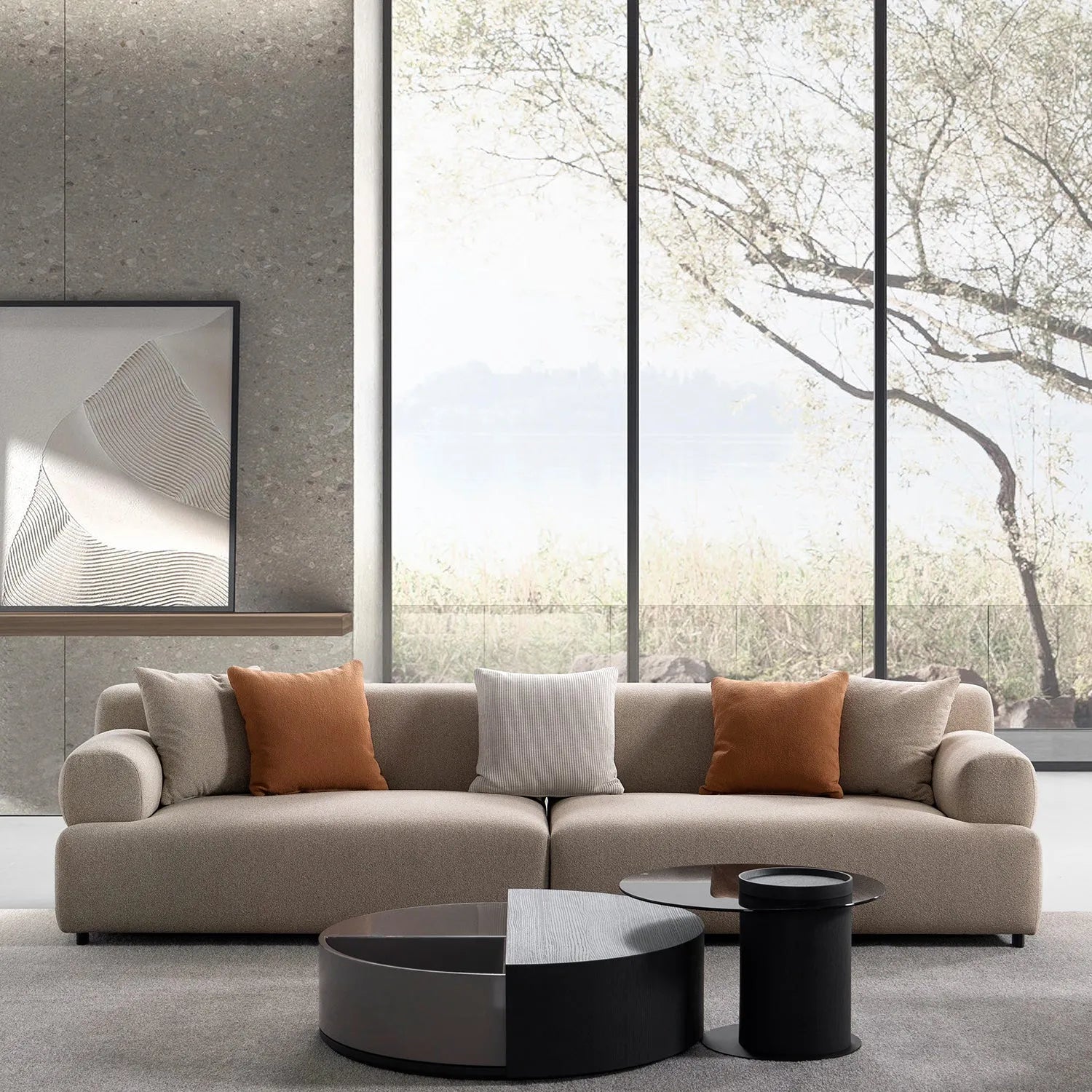 The sofa is covered in Sherpa fabric with a sophisticated beige-brown hue, adding a soothing, warm ambiance to any room. This fabric not only looks luxurious but also offers a cozy and inviting texture for ultimate relaxation. |
