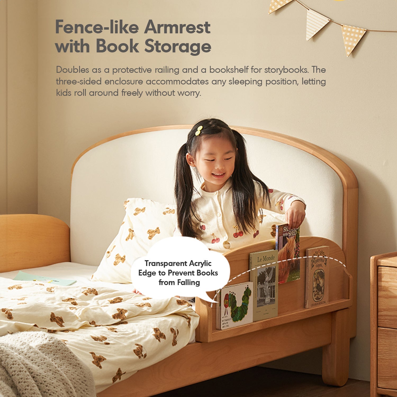 Doubles as a protective railing and a bookshelf, keeping storybooks within reach while allowing kids to roll freely and safely. |