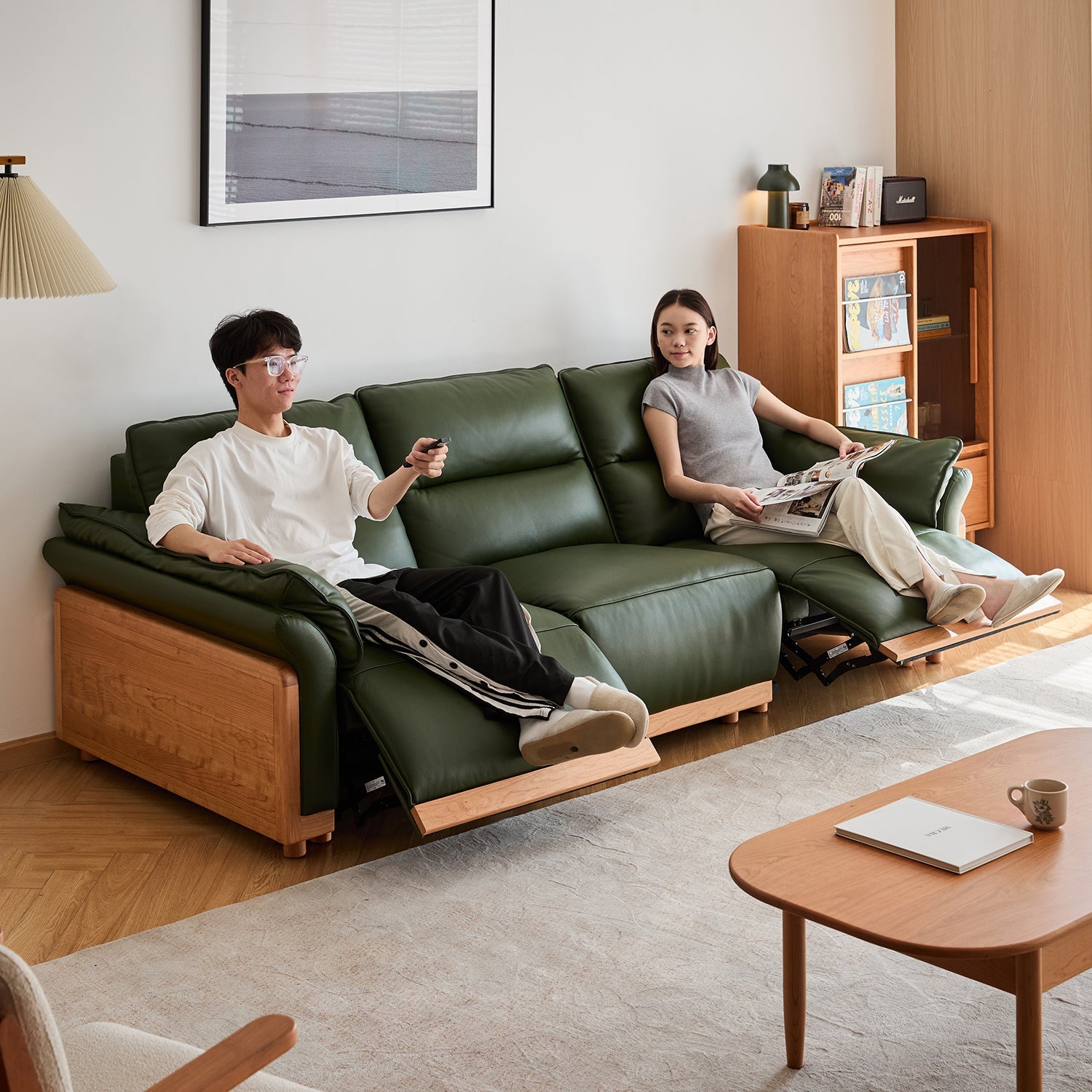 Scandinavian Cherry Wood Genuine Leather Electric Recliner 4 Seater Sofa EDGELESS offers smooth electric reclining, premium leather comfort, and spacious seating for relaxed family living in modern homes