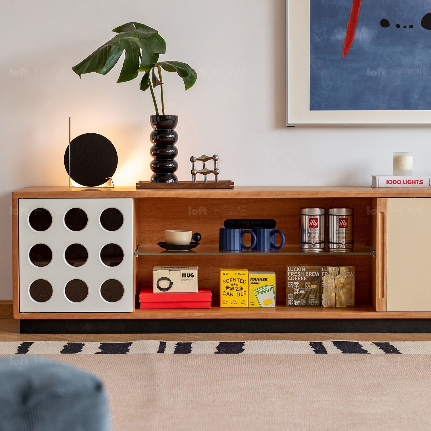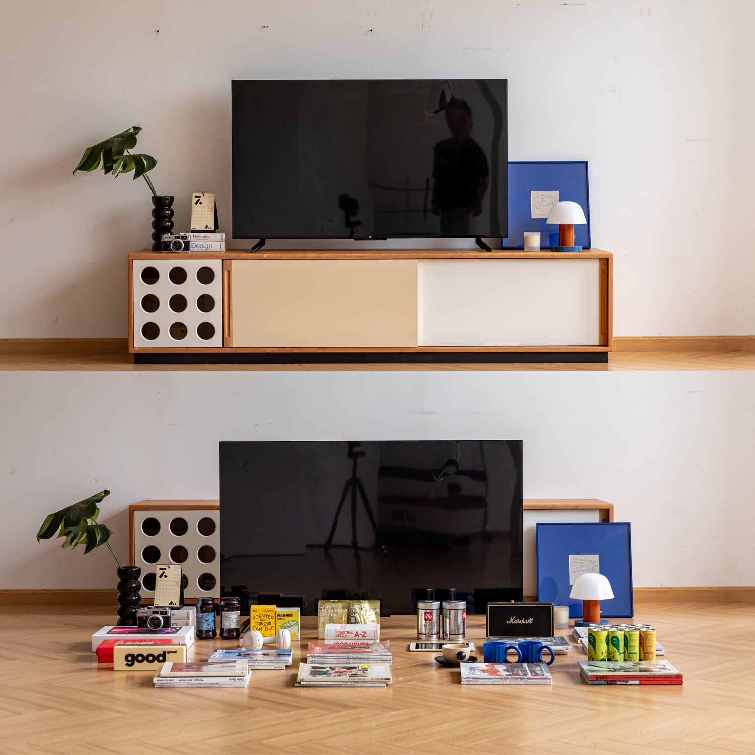 Scandinavian Cherry Wood Sliding Door TV Console TIMELESS blends vintage color-block charm with spacious storage, durable craftsmanship, and a perfect TV viewing height for stylish living.