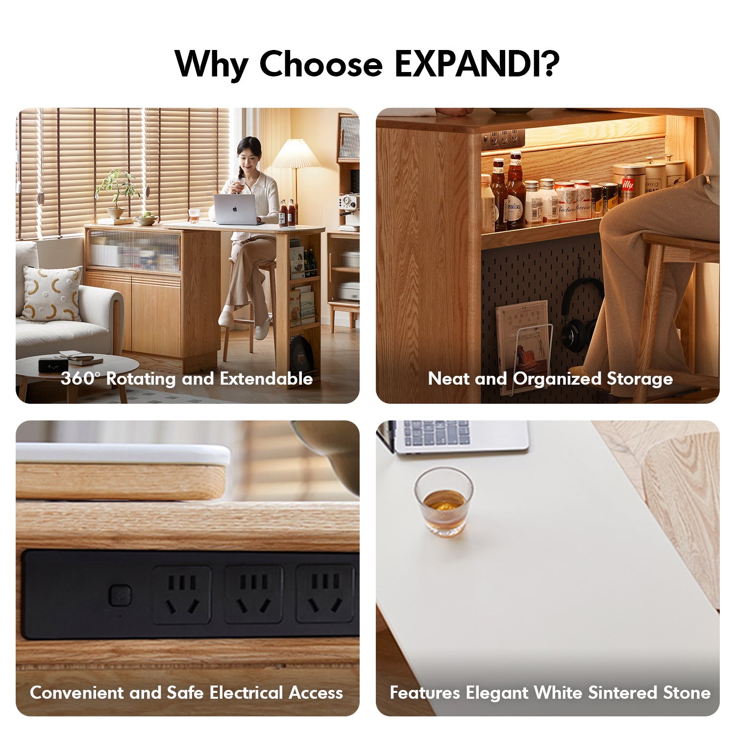 The Scandinavian Oak Wood Extendable Storage Bar Table EXPANDI combines premium North American FAS Grade Oak with a sleek, stain-resistant sintered stone countertop. Its 360° rotating, extendable design offers smart space-saving functionality, perfect for any corner. With built-in storage, adjustable shelves, and convenient electrical access, it's the ultimate blend of elegance and practicality - an ideal solution for organized, stylish Dining Space