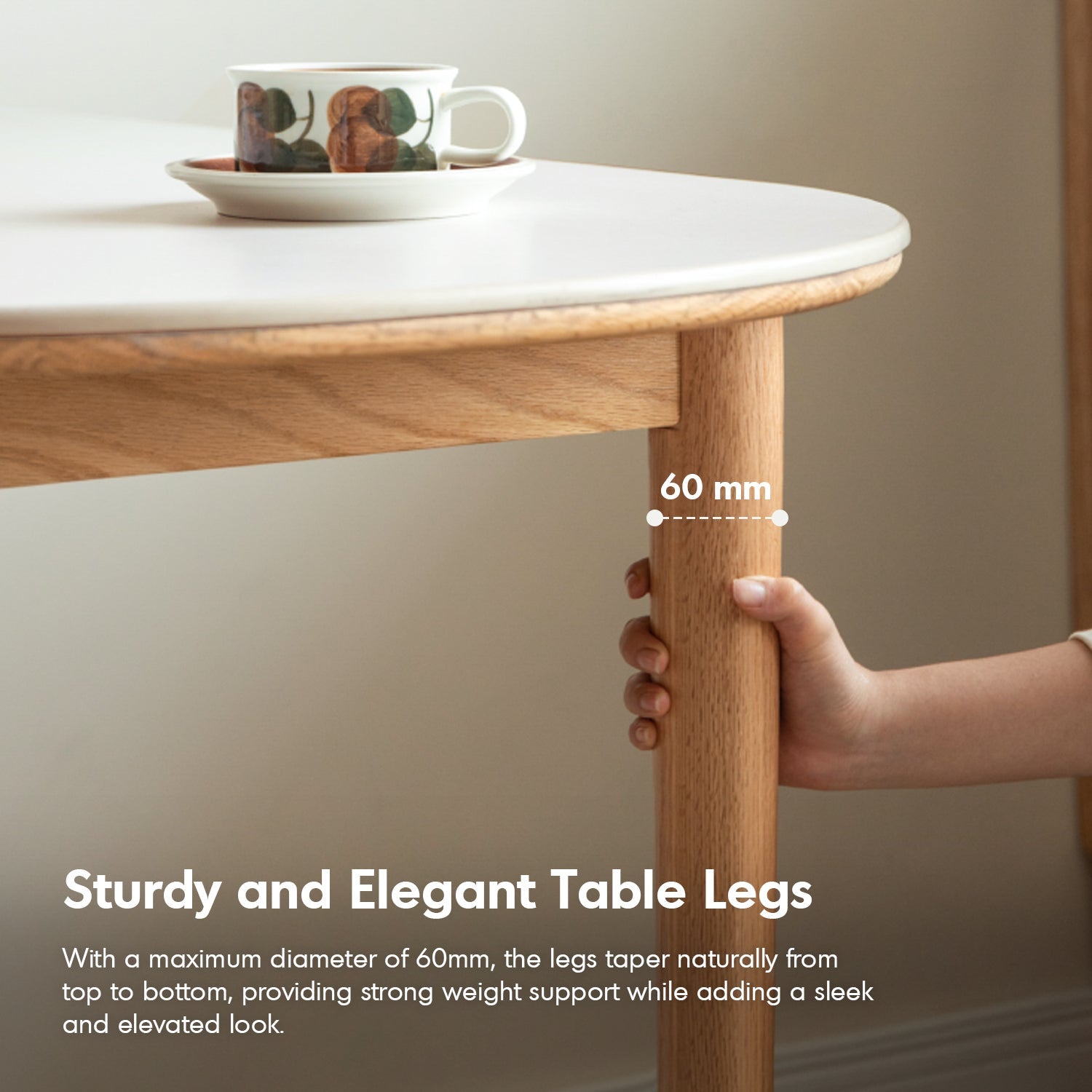 Solid wood base reinforced with a 70mm widened apron and tapered legs ensures exceptional stability and longevity. |