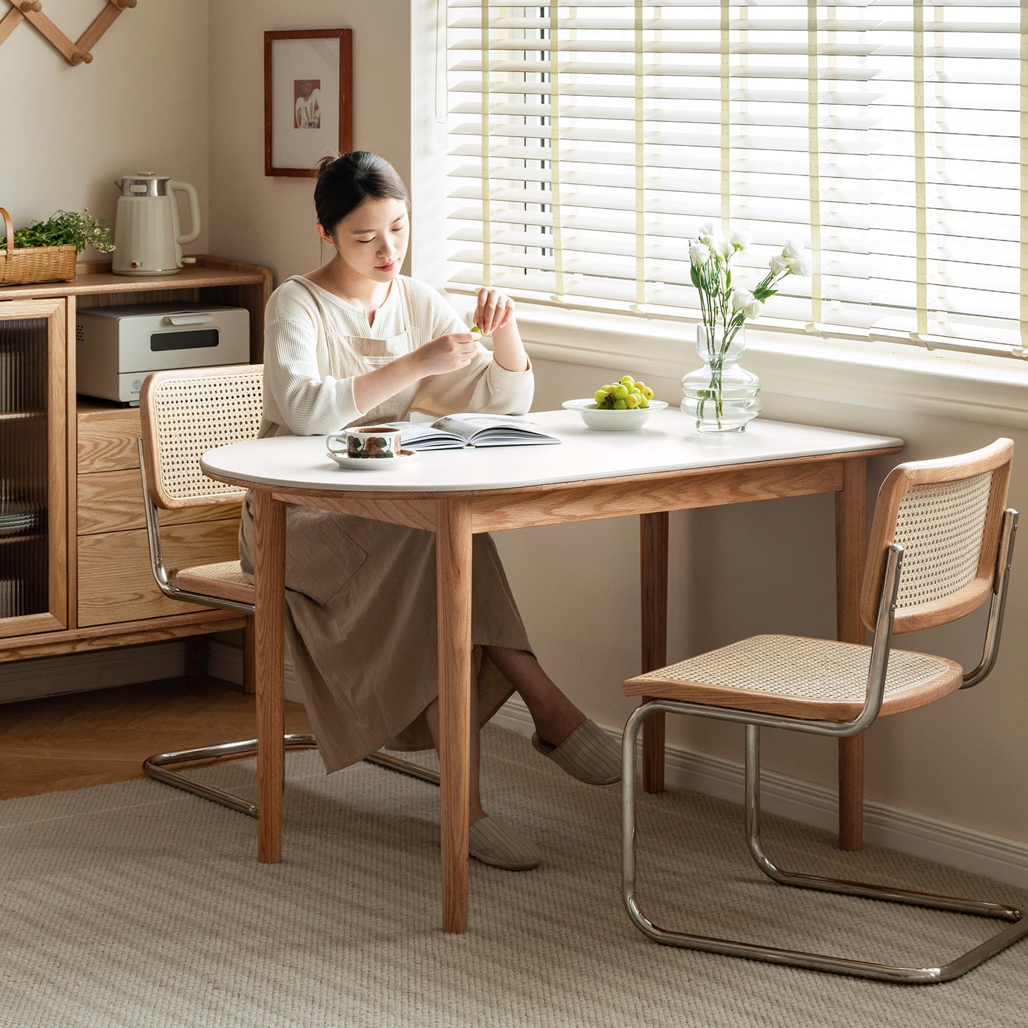 The Scandinavian Oak Wood Sintered Stone Half Oval Dining Table HALO blends innovative design with practical functionality. Its unique half-oval shape combines a square table's spaciousness with a round table's cosiness. Crafted from premium North American oak, it features a scratch-resistant, heat-resistant, and stain-resistant sintered stone top. The seamless wall-fit design saves space, while the sturdy construction ensures stability and durability.